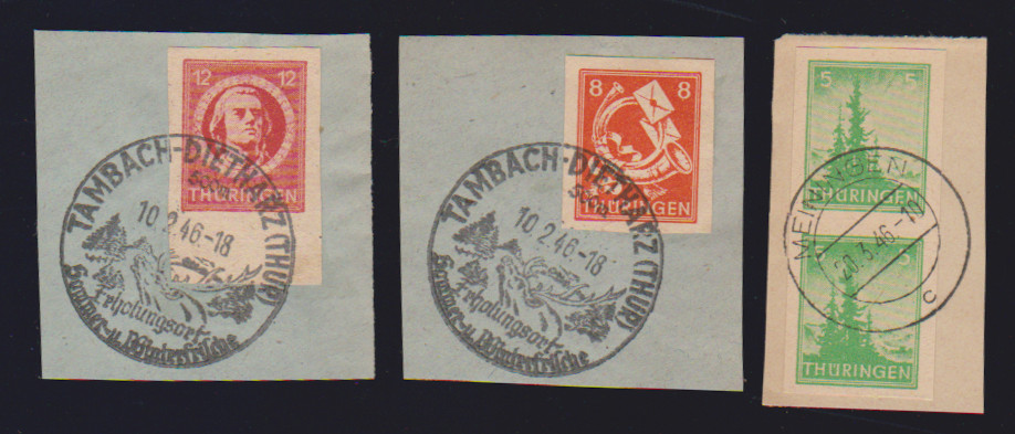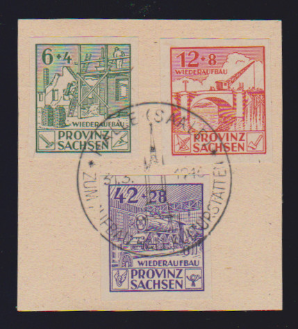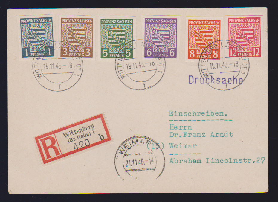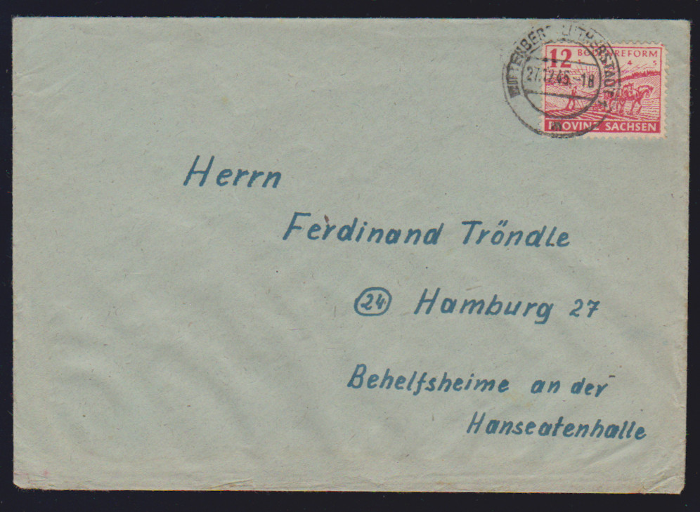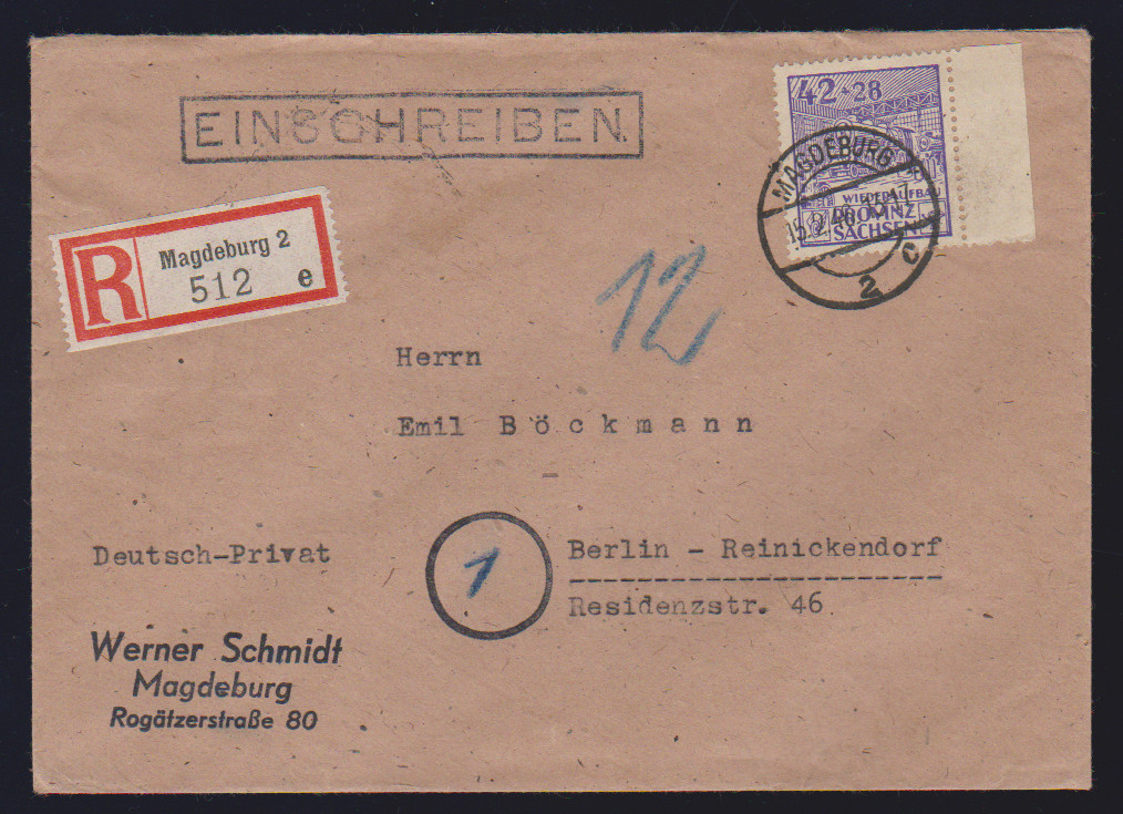 12 Pfg. Bodenreform, vierseitig gezähnt, als EF auf Brief von Wittenberg, 27.11.45 (sign. Ströh), sowie 42 + 28 Pfg. Wiederaufbau vom rechten Rand als EF auf Einschreibebrief aus Magdeburg. Mi. 320,- +