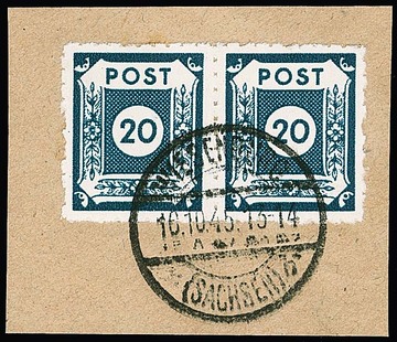 20 Pfg. dunkelpreußischblau mit nachträglichem Linien-Durchstich von Seiffen im Paar auf sauber gestempeltem Briefstück ("Wiesenburg"). Attest Ströh (für aufgeteilten Brief). Mi. lose 2000,- +