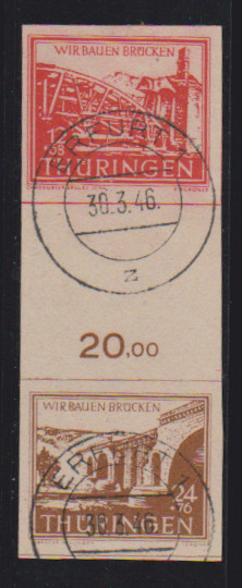 Herzstück von Brückenbau-Zusammendruckbogen, dabei 24 Pfg. in guter Farbe mittelrötlichbraun, auf tadellosem Briefstück mit Ersttagsstempel "Erfurt", Attest Jasch. Mi. 1000,-