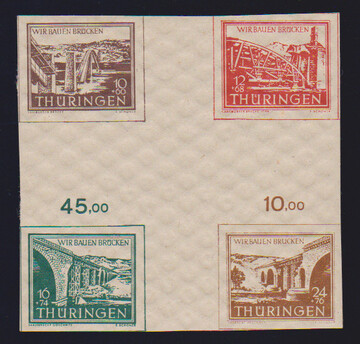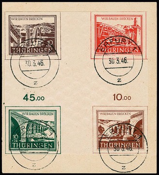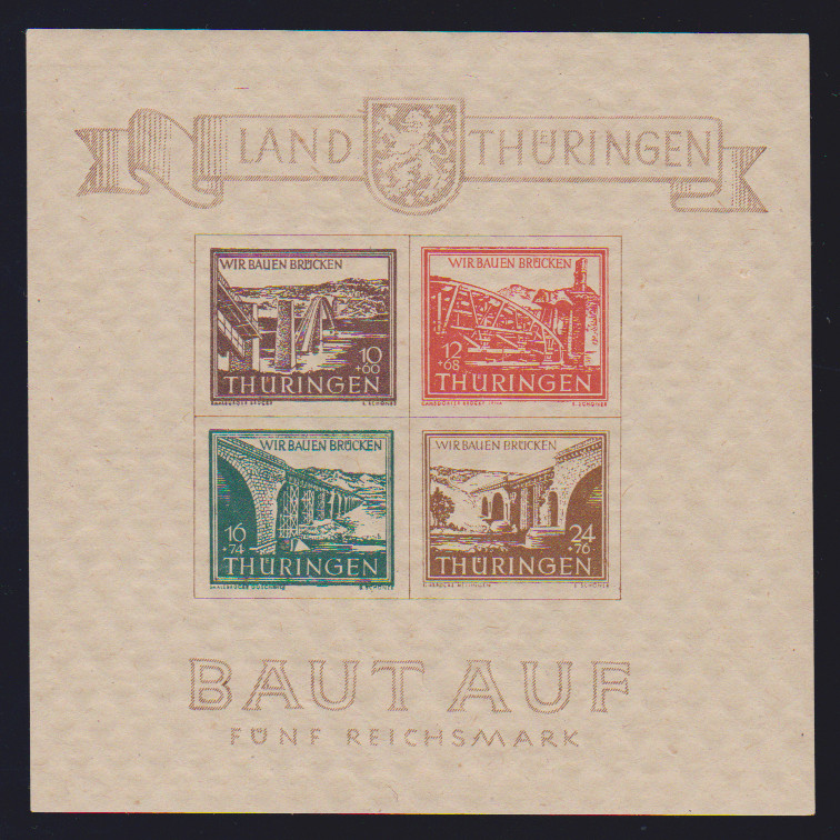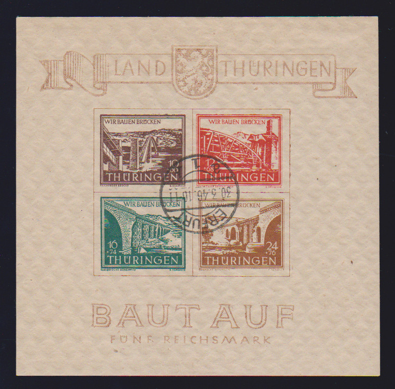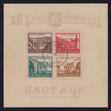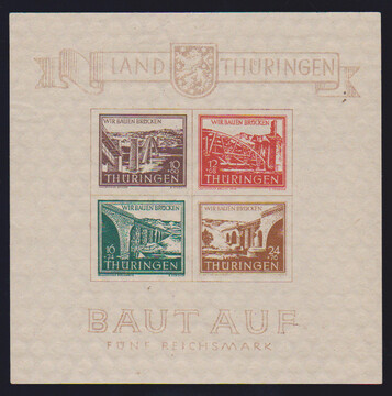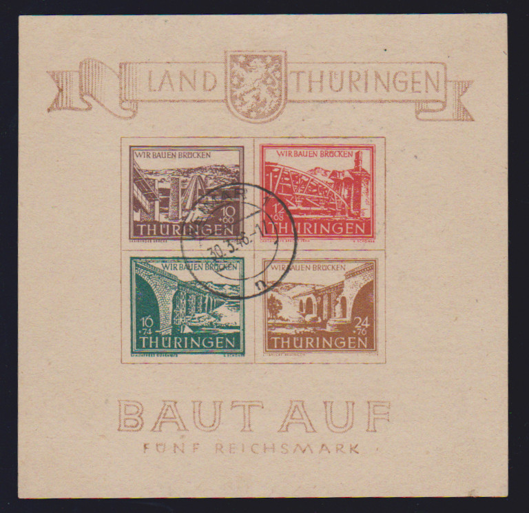 Brückenbau-Block mit Ersttagsstempel von Ruhla, Type I/III, tadellos. Attest Ströh "echt und einwandfrei". Mi. 1700,-