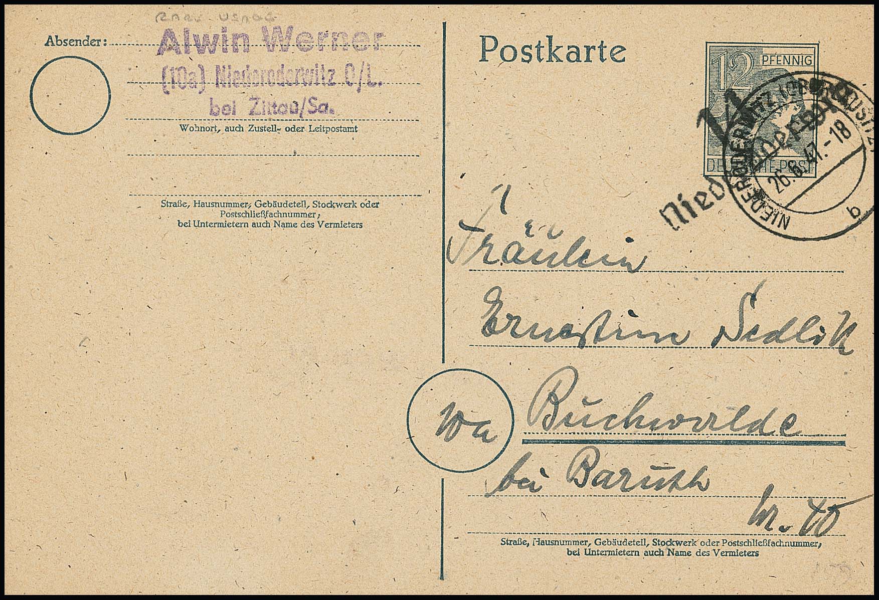 "14 Niederoderwitz" klar auf 12 Pfg. Ganzsachenkarte Arbeiter, in sehr guter Gesamterhaltung, gebraucht 26.6.47, Mi. 325,-