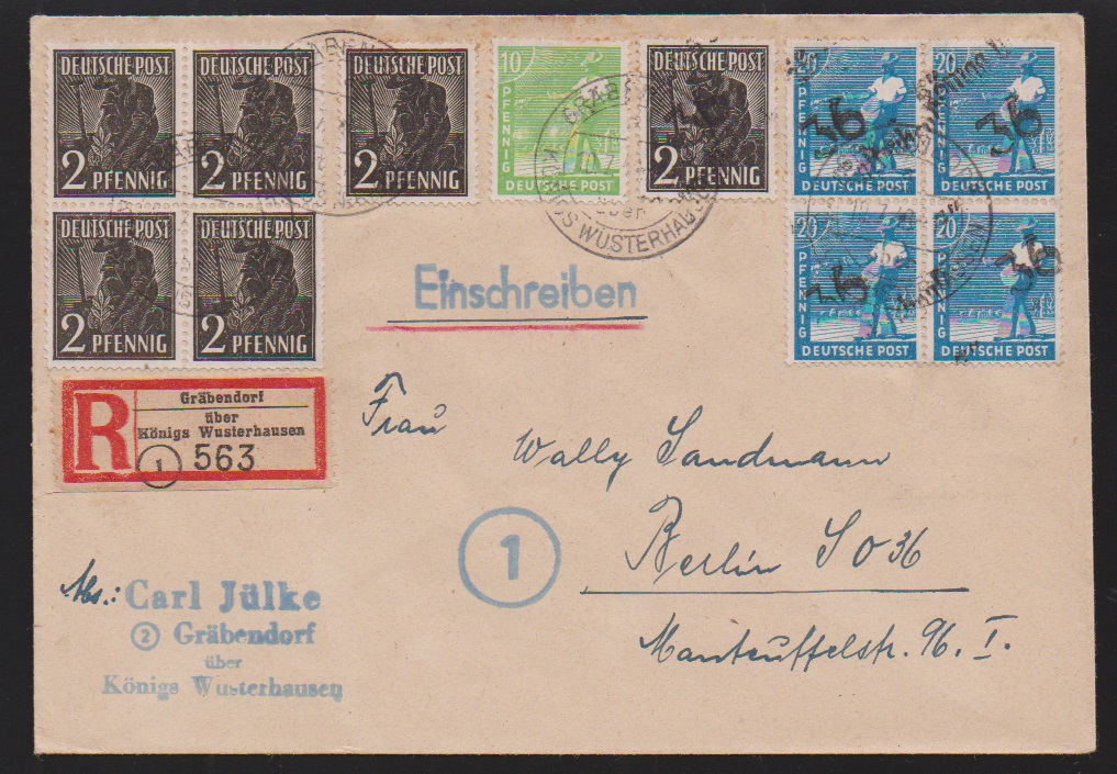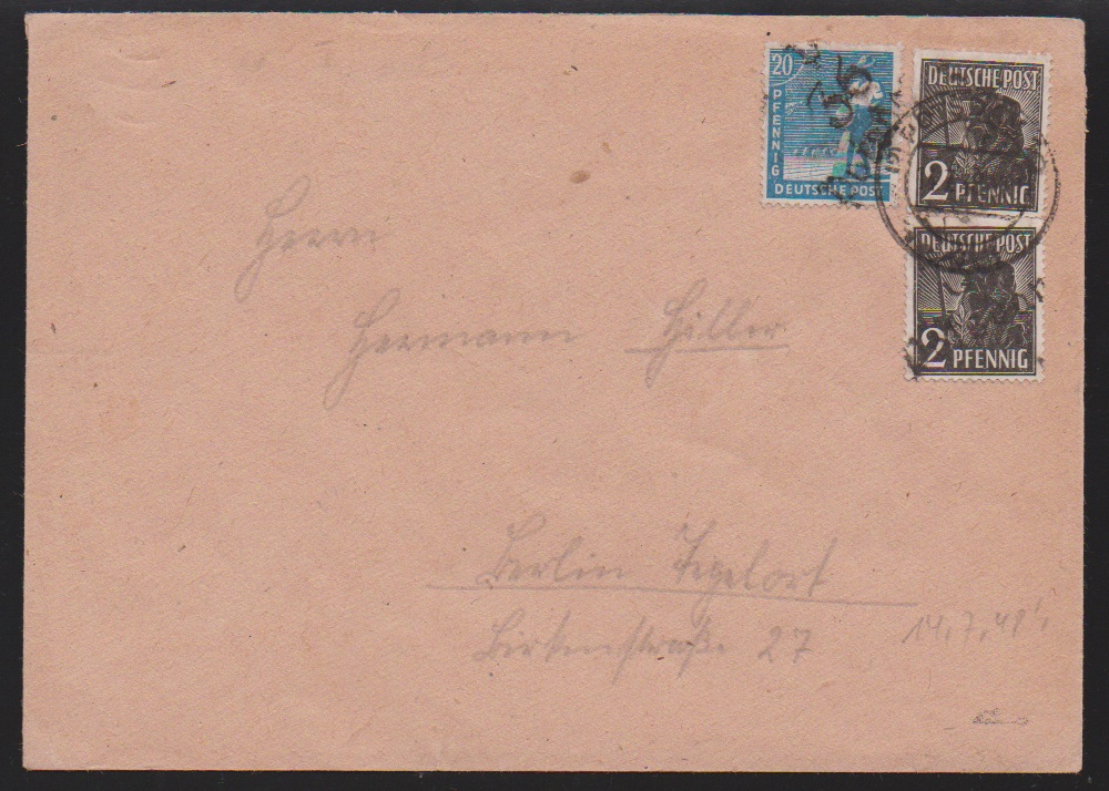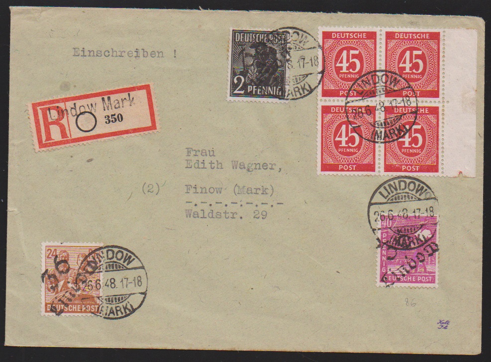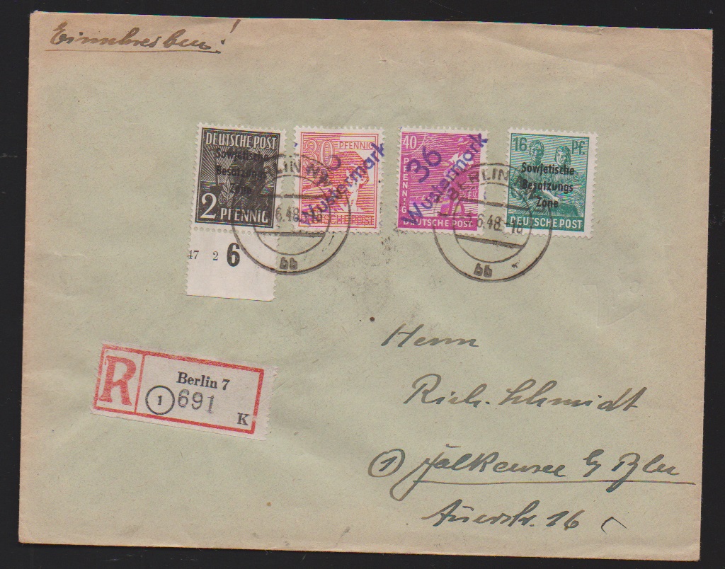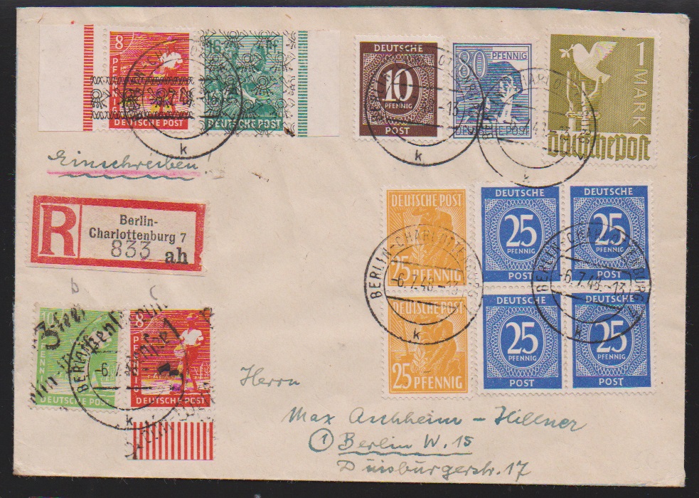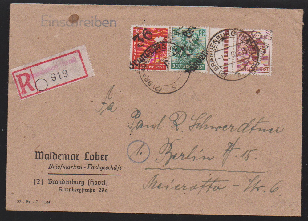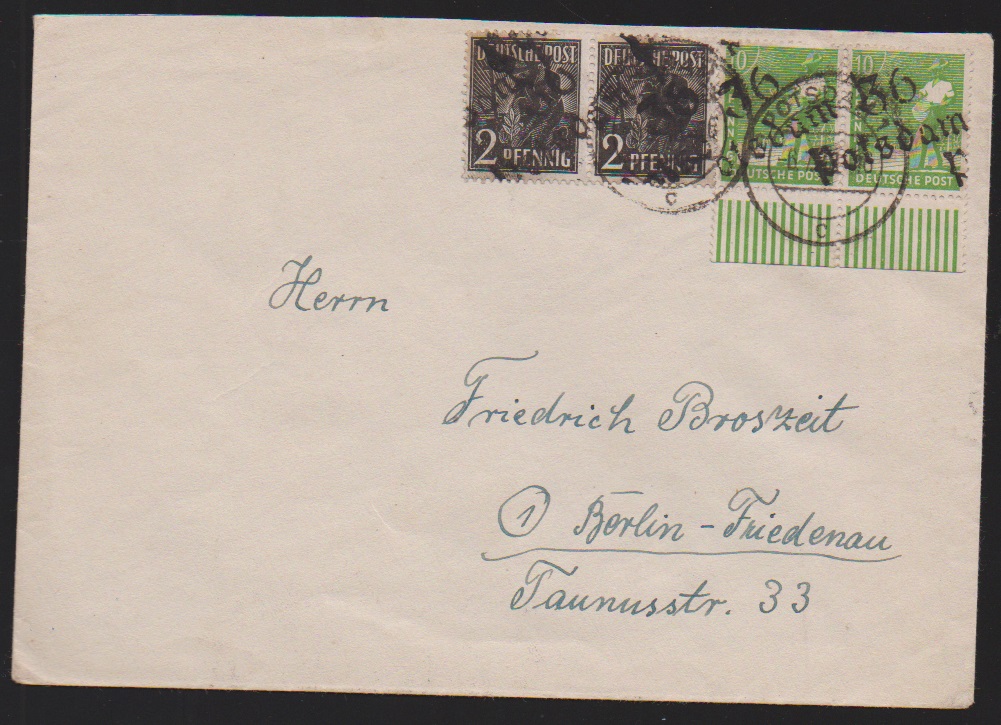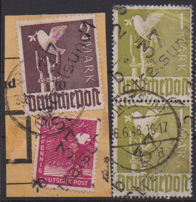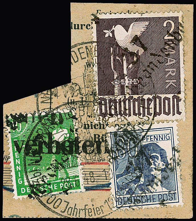 "36 Potsdam", drei Belege: 40 u. 80 Pfg. auf Paketkarte; je Paare 2 und 10 Pfg. (WUR) auf Brief, sowie 2(2) u. 20 Pfg. auf Brief vom 14.7.48, unbeanstandet verwendet, sign. Ballschmidt bzw. Maigatter