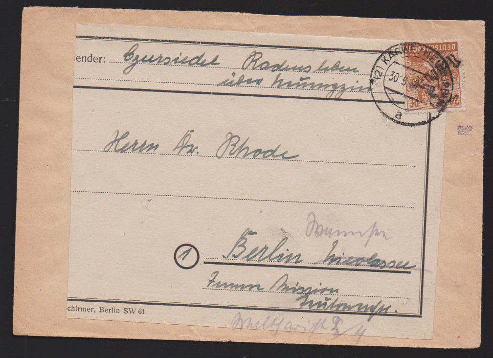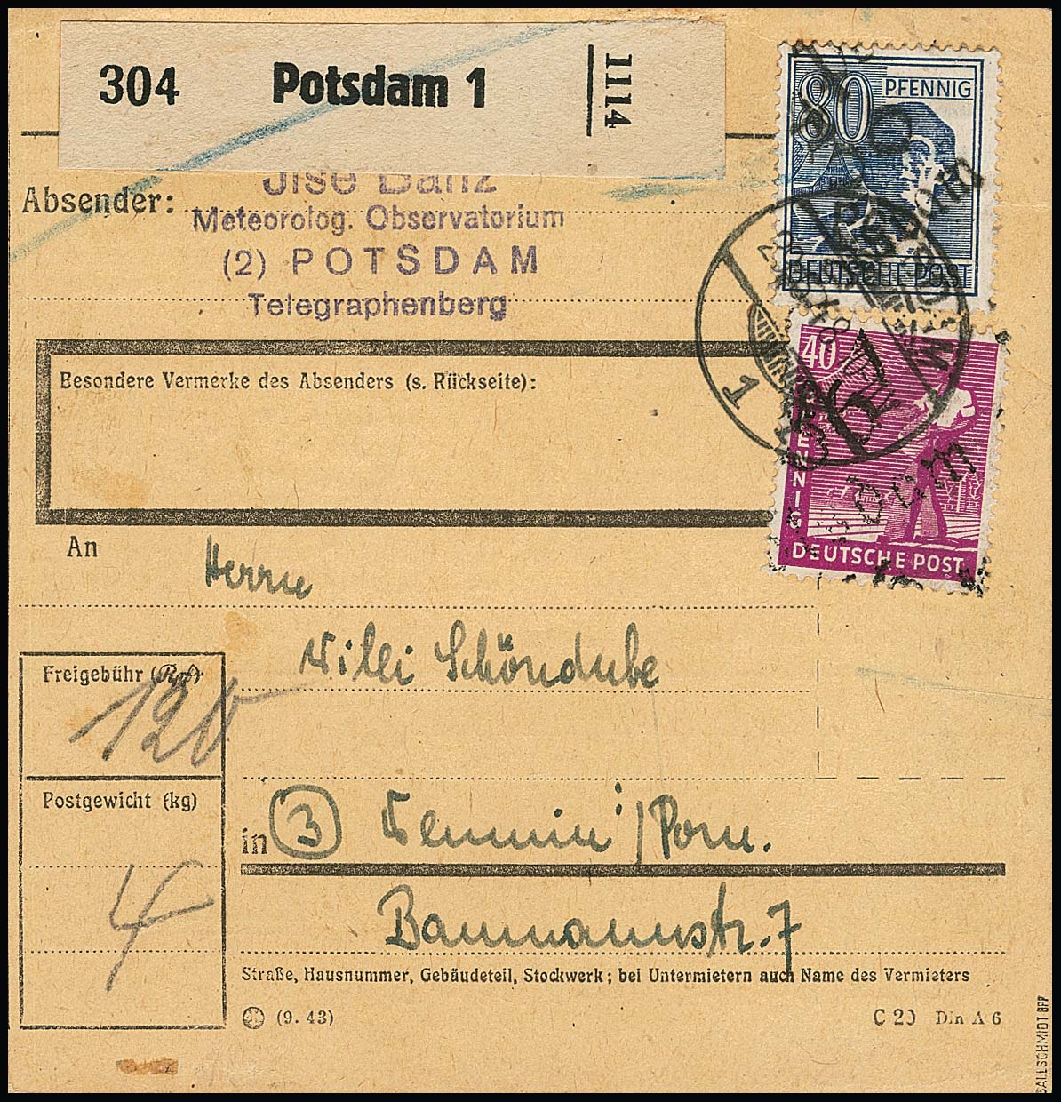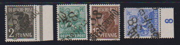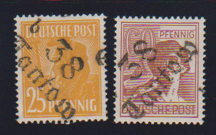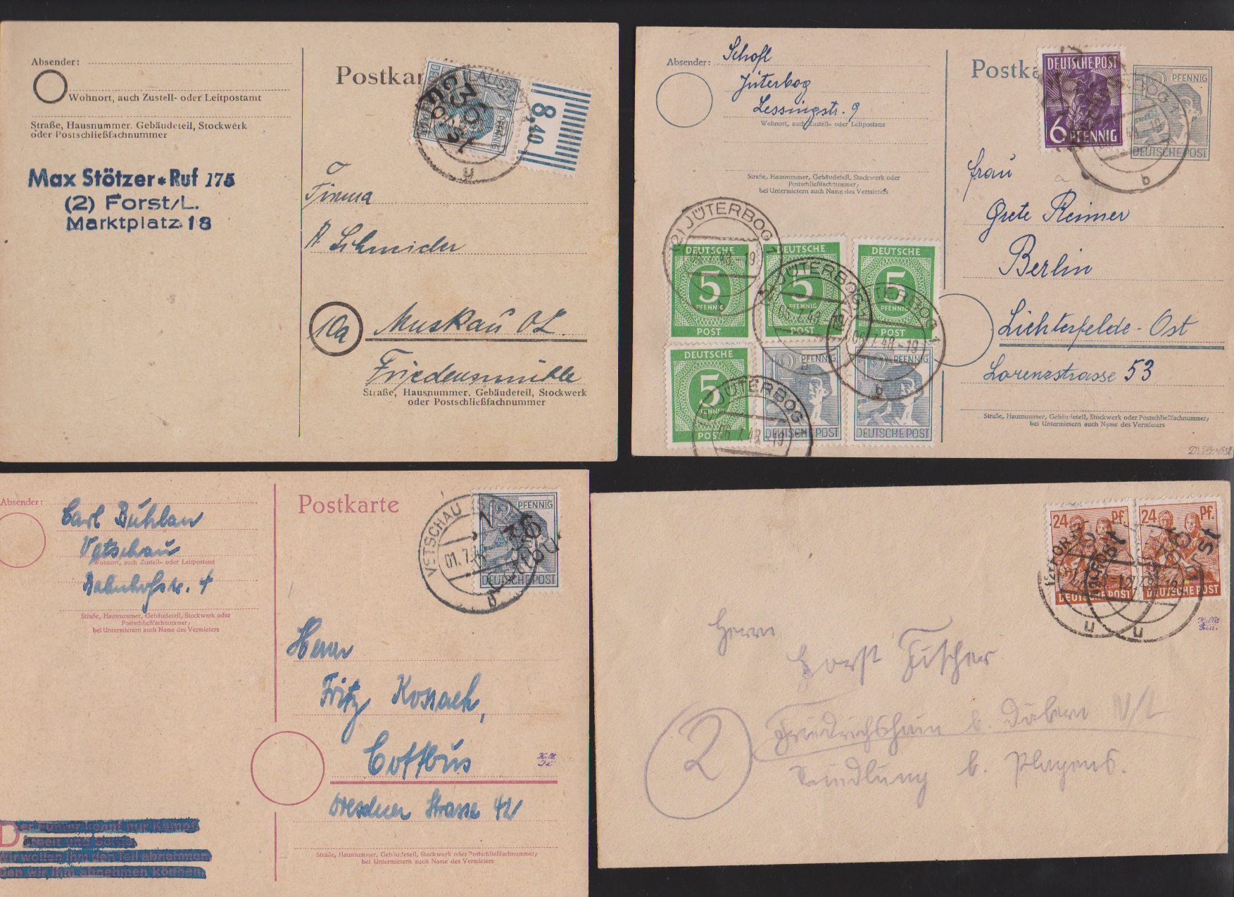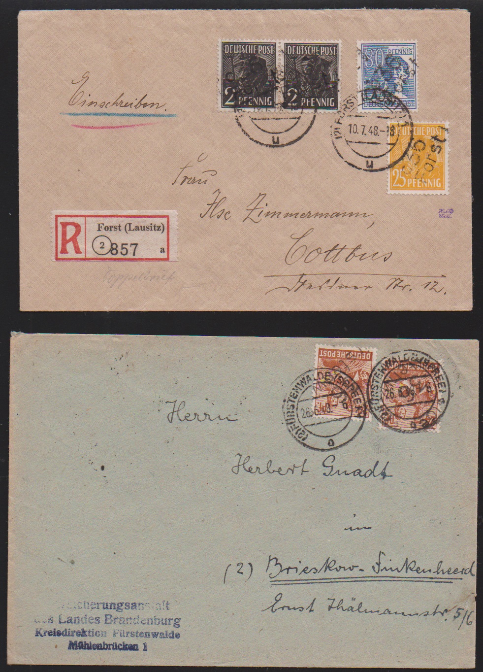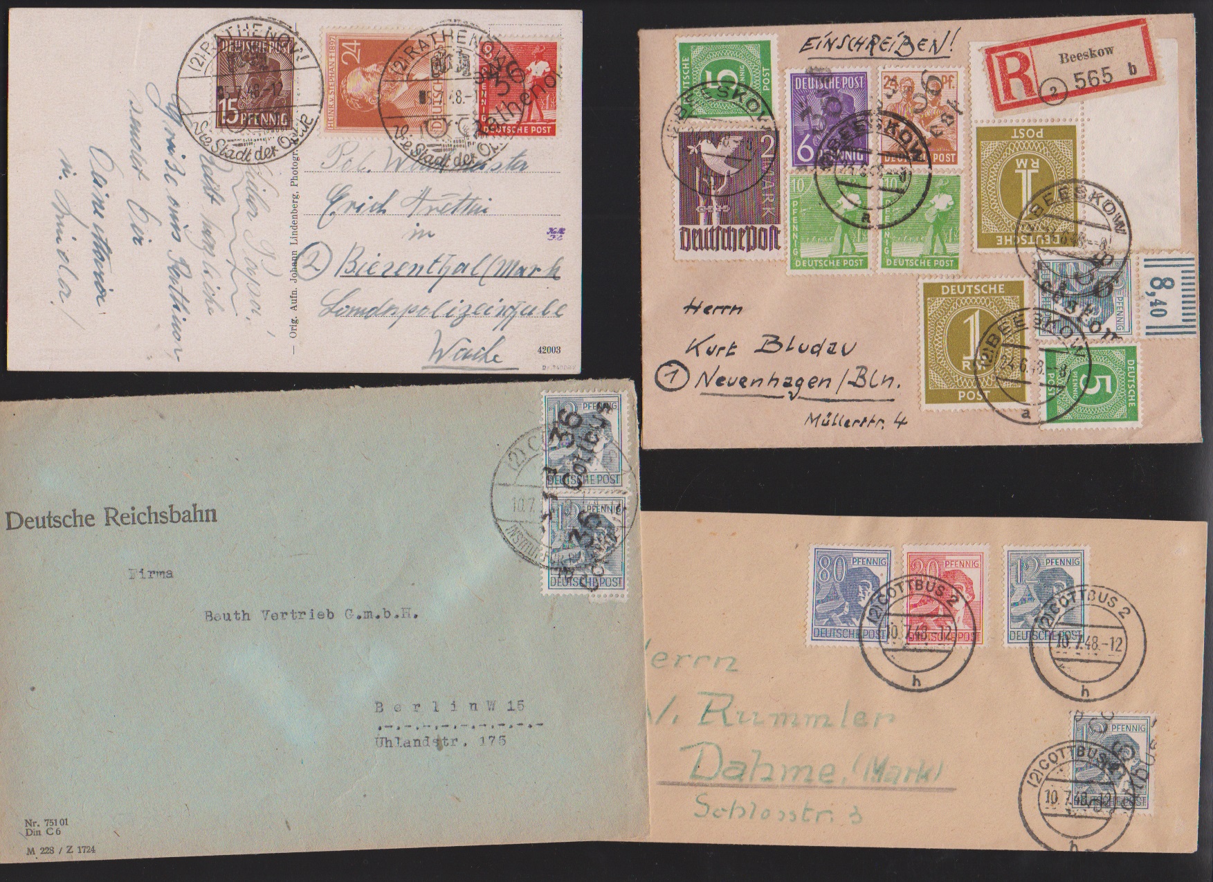 "36 Potsdam", drei Belege: 40 u. 80 Pfg. auf Paketkarte; je Paare 2 und 10 Pfg. (WUR) auf Brief, sowie 2(2) u. 20 Pfg. auf Brief vom 14.7.48, unbeanstandet verwendet, sign. Ballschmidt bzw. Maigatter