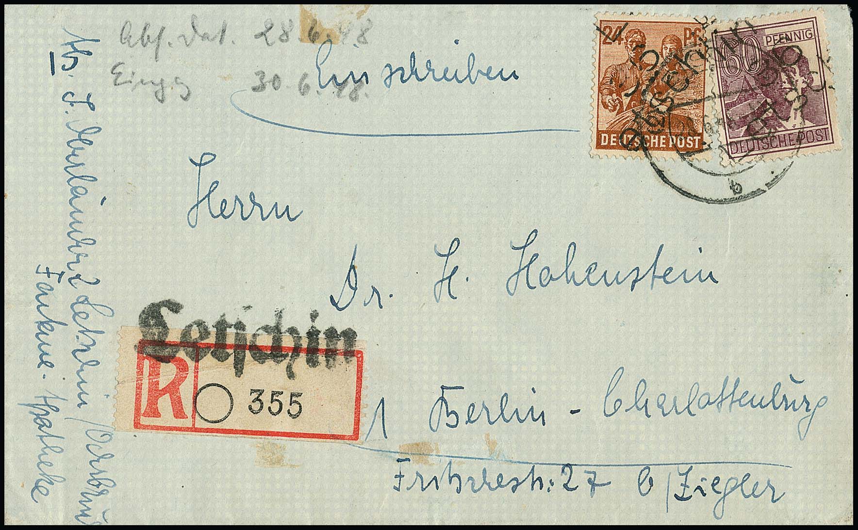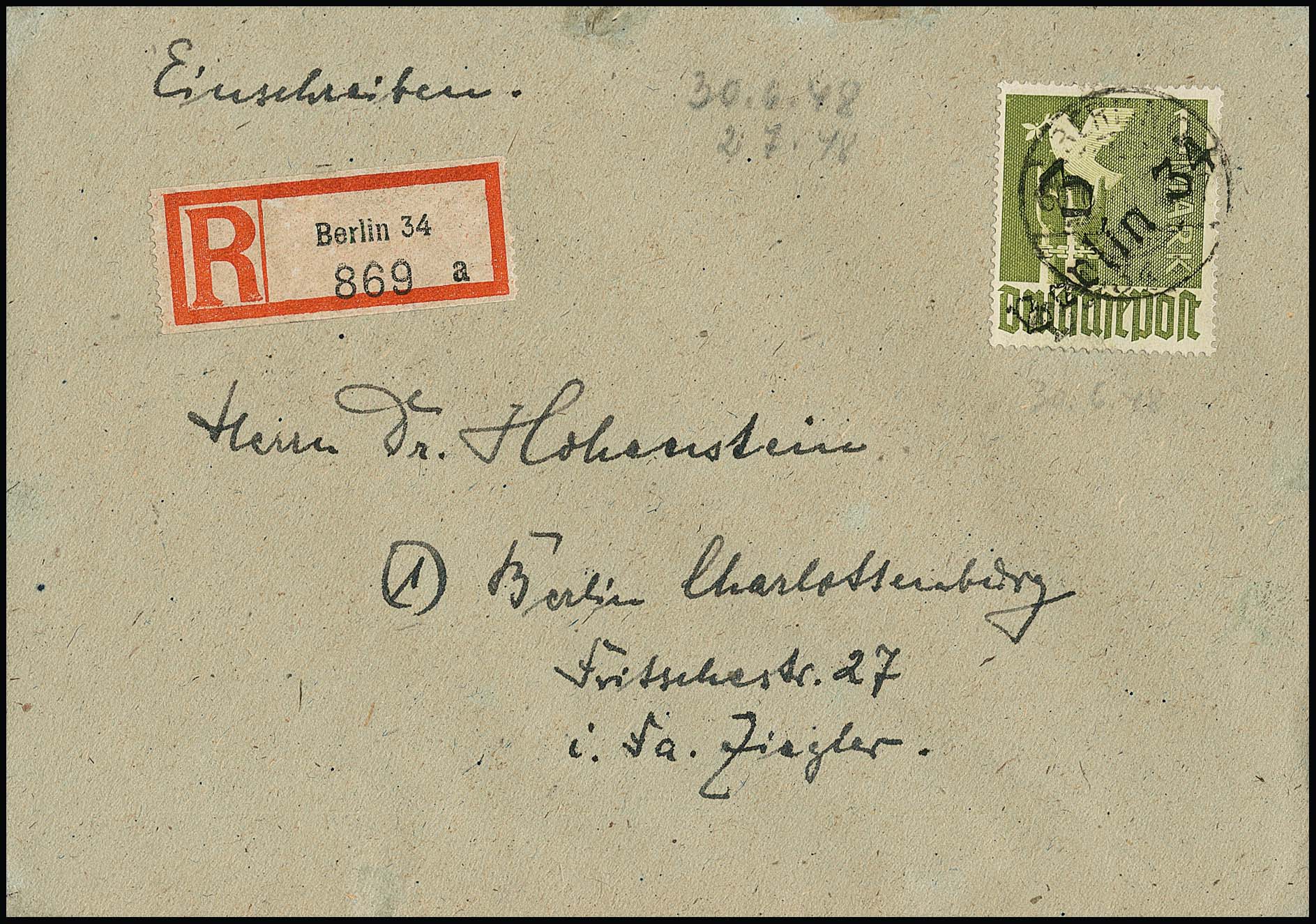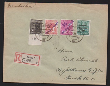 "3 Berlin", zwei Briefe und eine lose Marke: "3 Berlin-Weißensee 1" auf Orts-R-Brief West (!) mit u.a. 8 und 10 Pfg. Arbeiter, "3 Berlin Lichtenberg 1" auf ungebr. "heller 60er" (sign. Herbst), sowie "3 Berlin 34" auf Orts-R-Brief mit 1 Mk. Taube (Einlieferungsschein beiliegend, leichte Spuren)