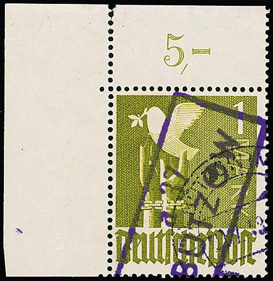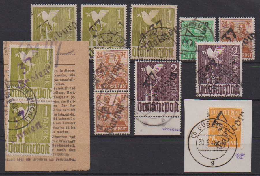 "37 (Boizenburg, a 37 Bützow als violetter Ra2, Dargun, Gnoien, Güstrow, Malchow, Neukalen, Putbus) auf 15 Werten inkl. 1 Mk. Taube (8), 2 Mk. Taube (2), sowie u.a. 25 u. 84 Pfg. Arbeiter. Mi. billigst 625,- + (versch. Typen), alle kompetent geprüft