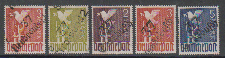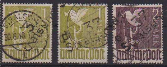 "c 37 Neubrandenburg" auf 3 Mk. Taube und "b 37 Stralsund 2" auf 1 Mk. Taube, je postfrisch, sowie "37 Gadebusch" auf ungebr. 2 bis 5 Mk. Taube, sign. Böheim bzw. Lieder. Mi. 282,-