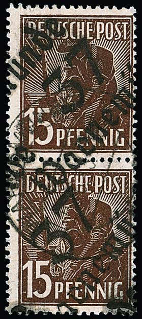 "37 Warnemünde" auf senkrechtem Paar 15 Pfg. Arbeiter gest., sign. Modry. Mi. 600,-