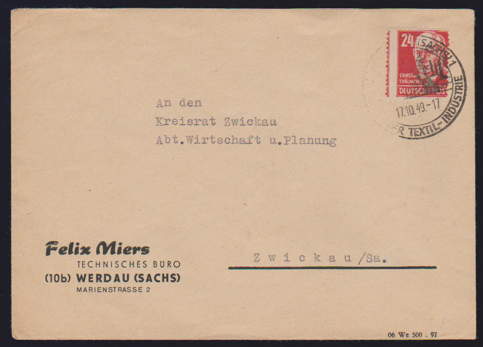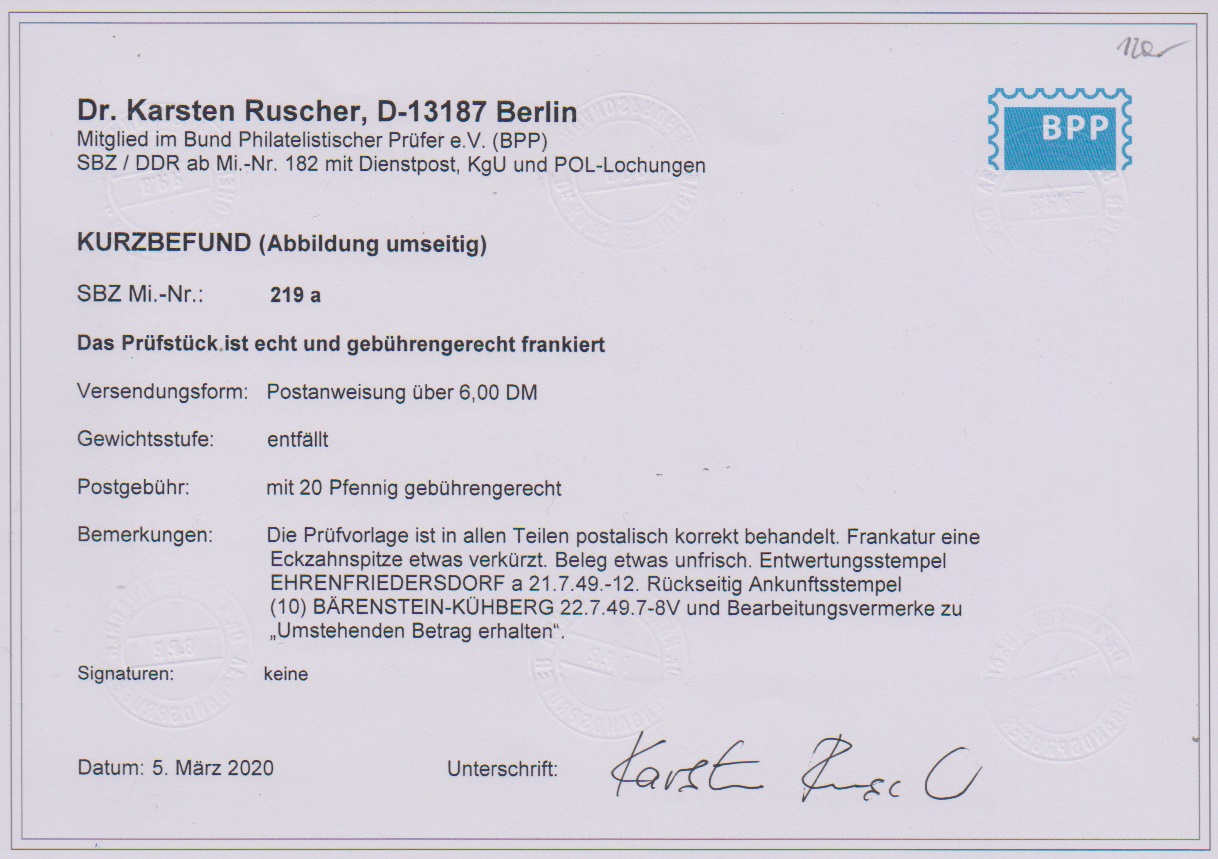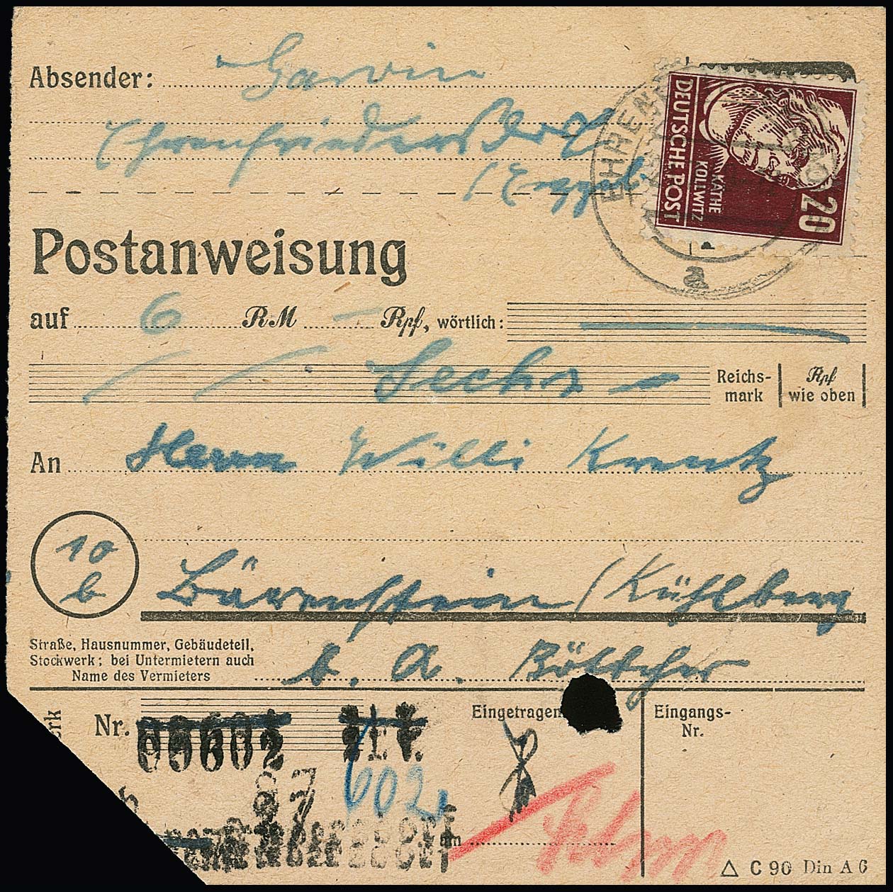 20 Pfg. Kollwitz (eine gering verkürzte Zahnspitze) als Einzelfrankatur auf Postanweisung aus Ehrenfriedersdorf 1949, Fotoexp. Ruscher