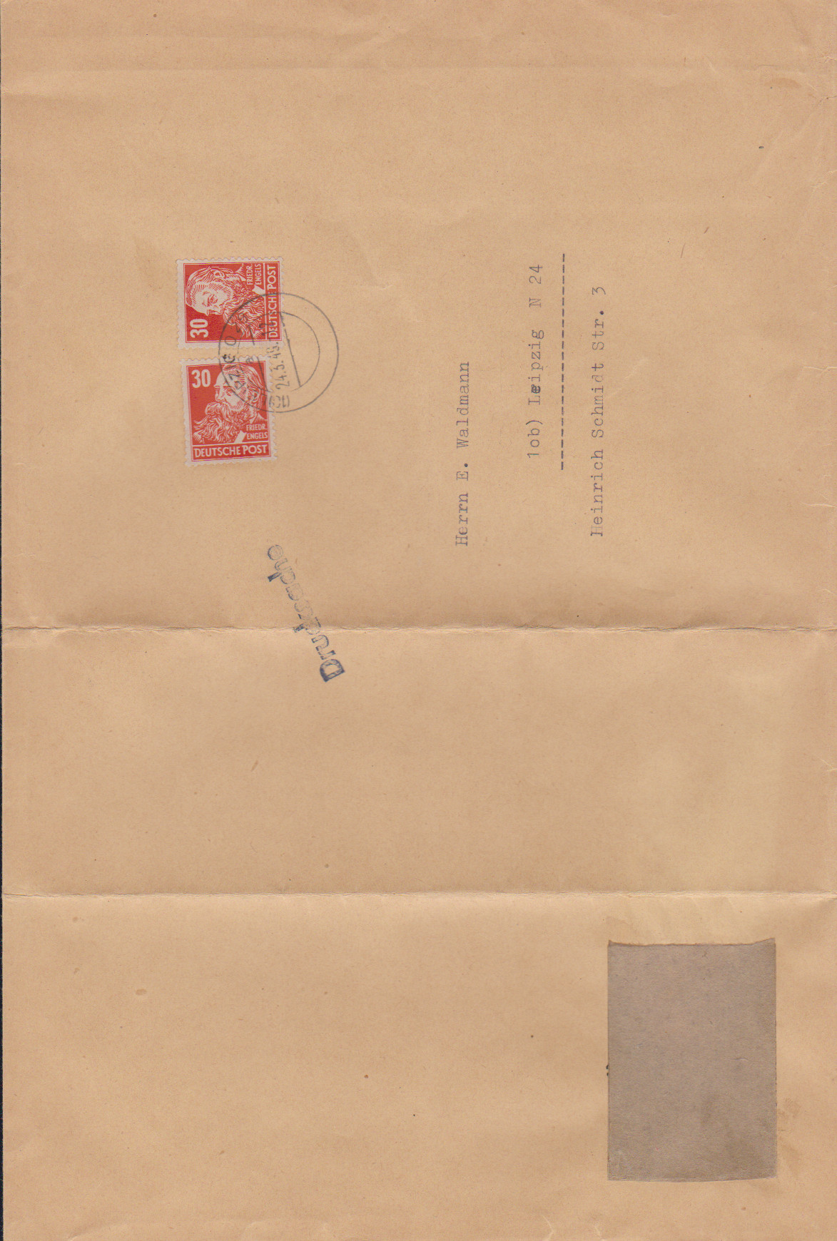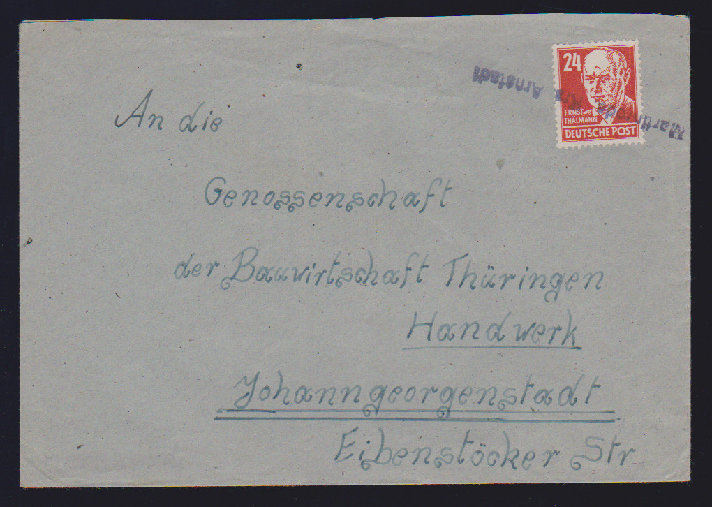 24 Pfg. Köpfe I, normal gez., auf Bedarfsbrief mit seltenem violettem Not-L1 "Martinroda (Kr. Arnstadt)"