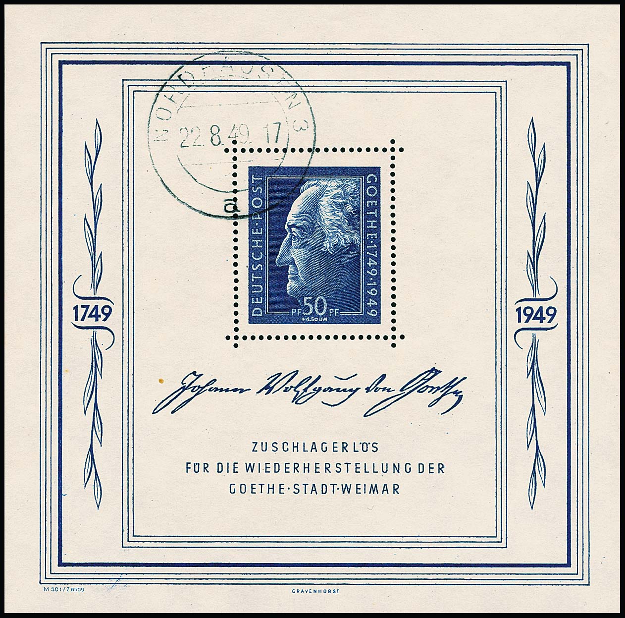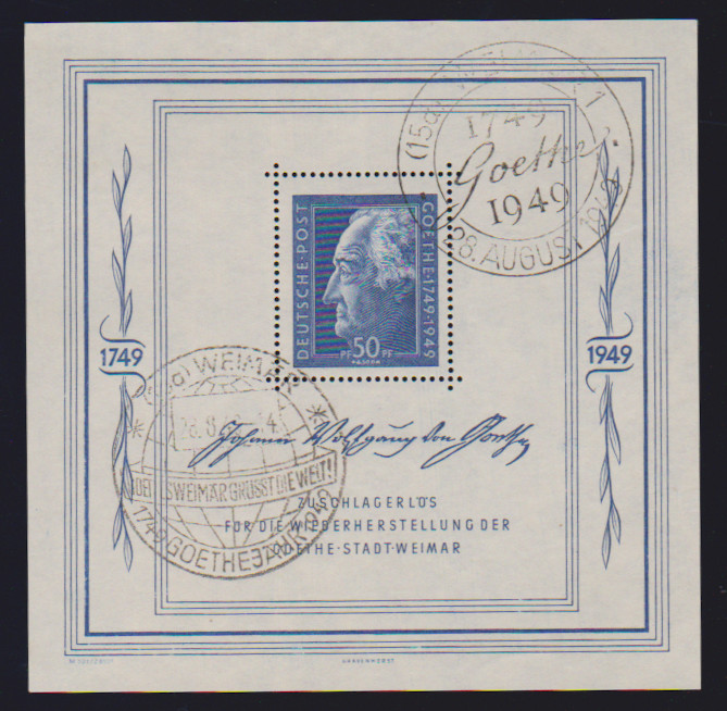 Goethe-Block (leichter Eckbug) mit Ersttags-Tagesstempel von Nordhausen, 22.8.1949, sehr selten, da der Block sonst nur mit SST vorkommt. Sign. Weigelt