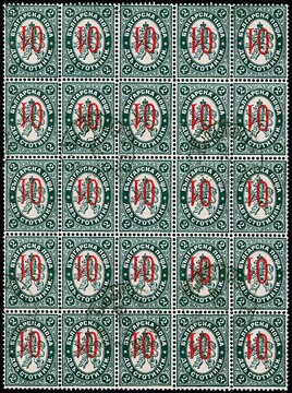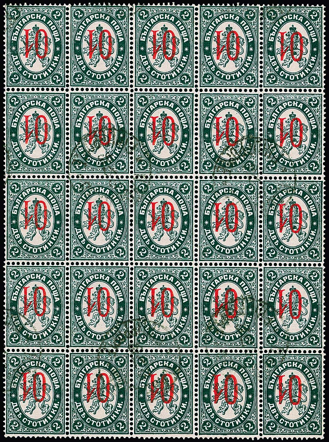 01 auf 2 St. Wappenlöwe im gestempelten 25er-Block mit kopfstehendem Aufdruck