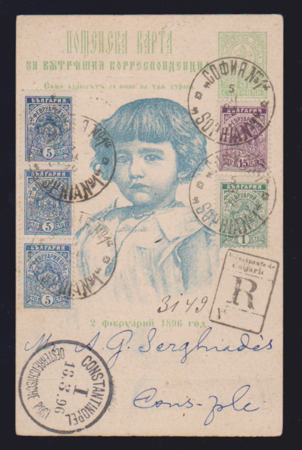 1 St., Dreierstreifen 5 St. und 15 St. auf Ganzsachenkarte 5 St., als R-Karte von Sofia 1896 nach Constantinopel