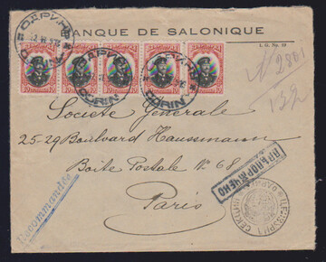 10 St. per fünf auf R-Brief aus der Zeit der Besetzung in Griechenland, von "Odvin" als Recobrief der "Banque de Salonique" 1913 nach Paris