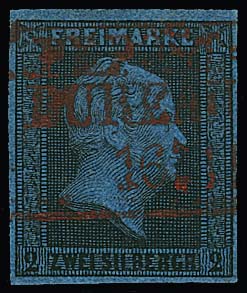 2 Sgr. schw./blau, Kabinettstück mit hierauf seltener Entwertung durch roten Bahnpost-Speditions-Ra3, Attest Wasels: "Rote Stempel auf der ersten Ausgabe sind besonders selten".