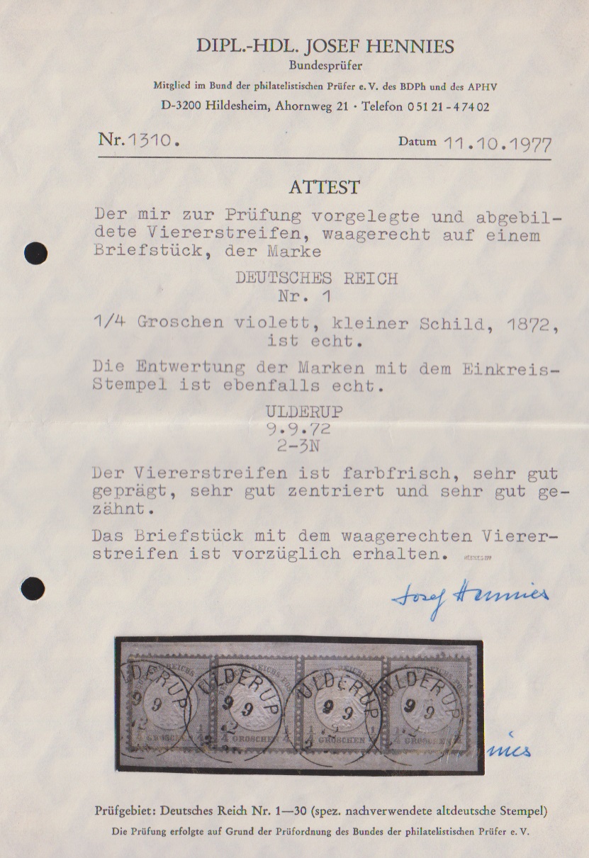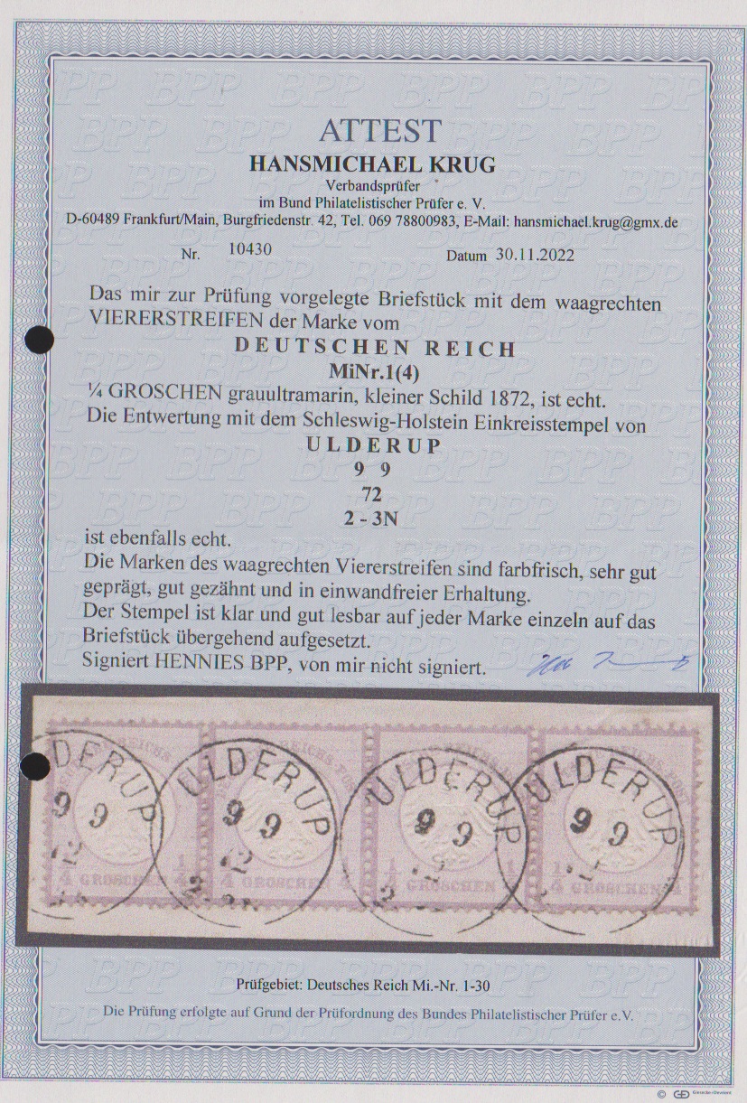 1/4 Gr. graupurpur im Viererstreifen auf Kabinettbriefstück mit Schleswig-Holstein-K1 "Ulderup" klar, Mi. 800,-, Atteste Krug ("einwandfrei") und Hennies ("vorzüglich erhalten")