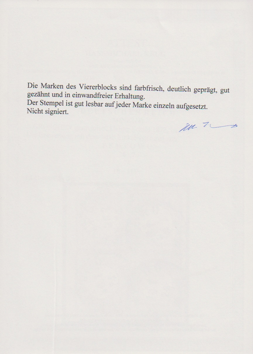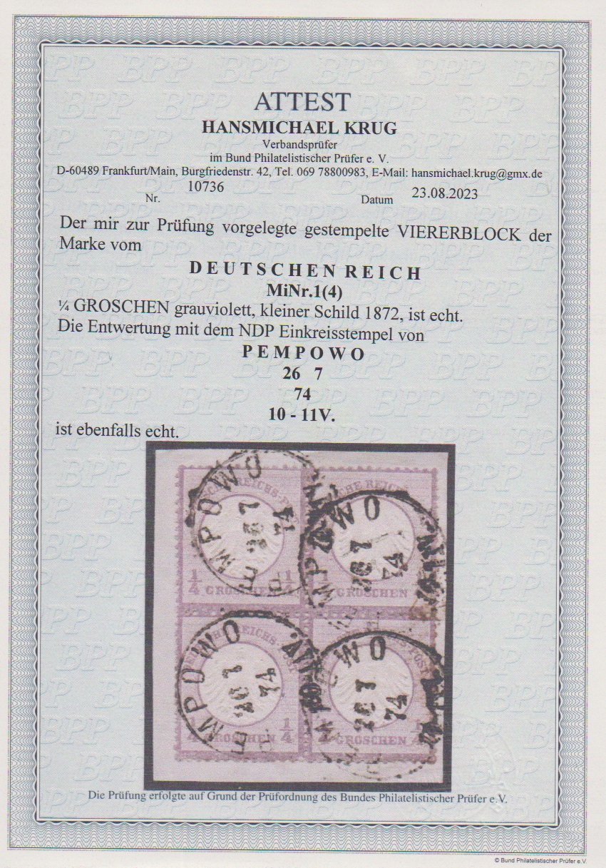 1/4 Gr. grauviolett im Viererblock auf Kabinettbriefstück mit besserem NDP-K1 "Pempowo" und rechts kleinen Federzügen. Mi. 800,-, Attest Krug "einwandfrei"
