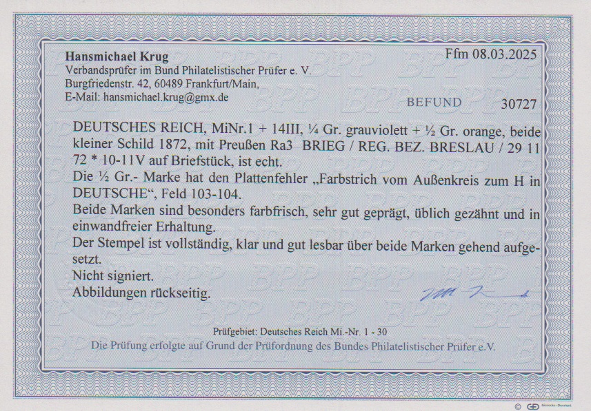 1/4 Gr. violett und 1/2 Gr. orange (mit Plattenfehler "Farbstrich vom Aussenkreis") auf Kabinettbriefstück mit klarem Ra3 "Brieg Reg. Bez. Breslau", Fotoexp. Krug