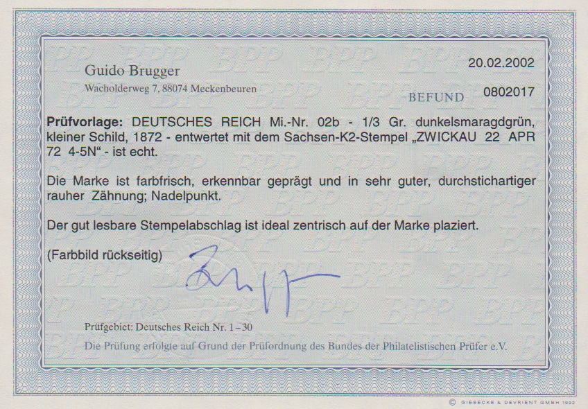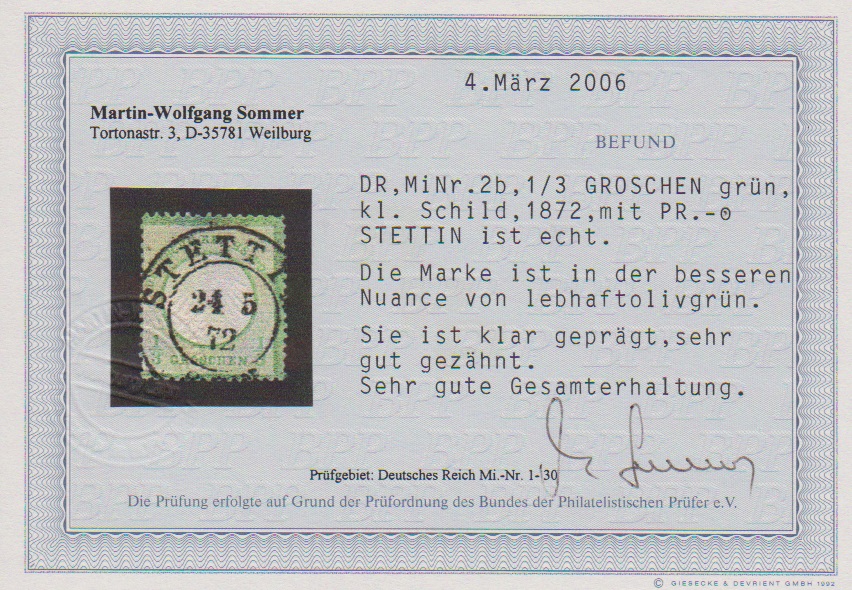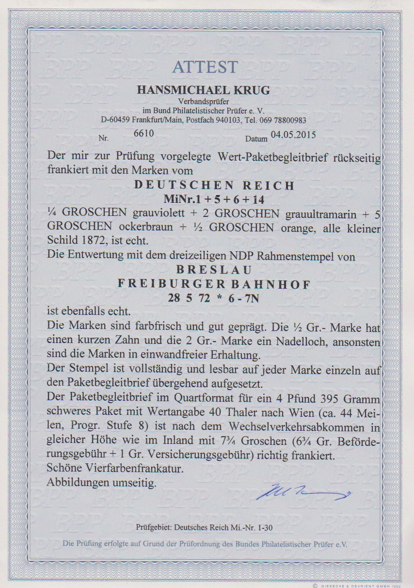 1/4 Gr. violett, 2 Gr. blau, 5 Gr. ockerbraun und 1/2 Gr. orange rückseitig auf vorgedrucktem Wert-Paketbegleitbrief mit Ra3 "Breslau Freiburger Bahnhof". Die 1/2 Gr. mit einem unbedeutend verkürztem Zahn und die 2 Gr. kleines Nadelloch, sonst eine "schöne Vierfarbenfrankatur", wie auch das Attest Krug bestätigt