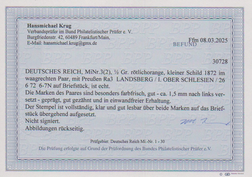 1/2 Gr. ziegelrot, sehr farbfrisches Paar mit deutlich versetzter Prägung auf Kabinettbriefstück mit klarem Ra3 "Landsberg i. Oberschlesien", Fotoexp. Krug