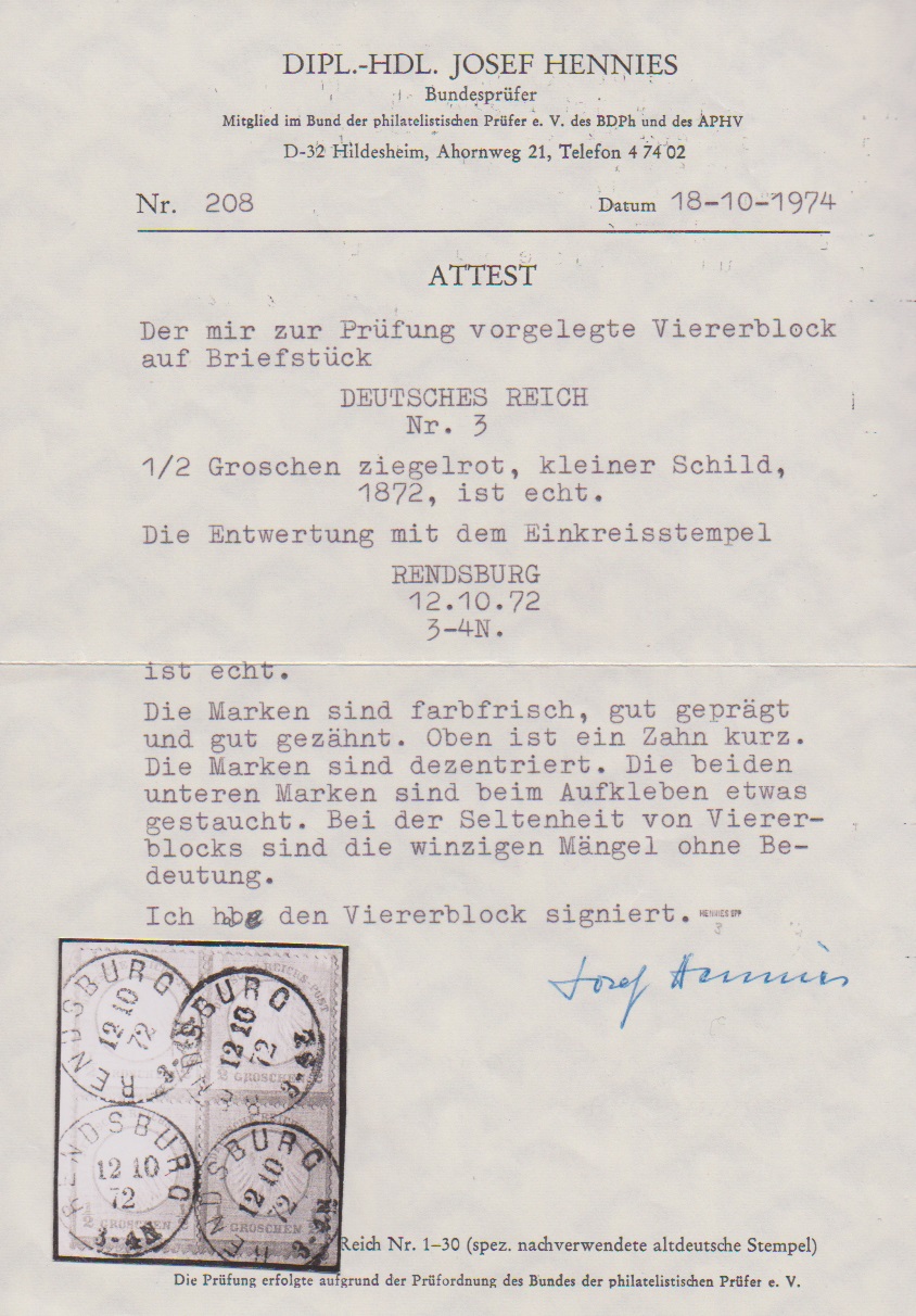 1/2 Gr. rotorange, prachtvoller Viererblock auf Briefstück mit klaren K1 "Rendsburg", oben links ein Zahn leicht verkürzt, Attest Hennies. Mi. 900,-