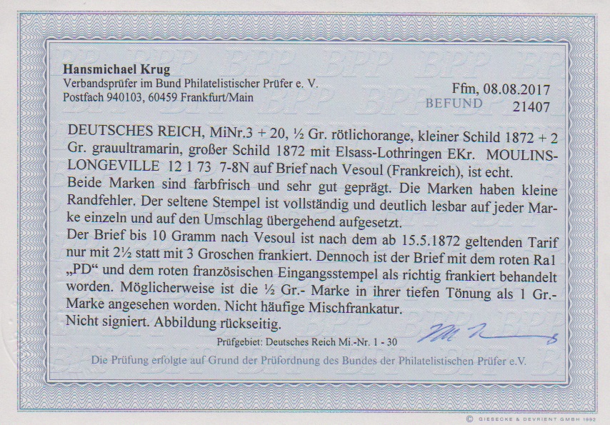 Zwei Damen-Couverts aus gleicher Korrespondenz mit besserem Elsaß-Lothringen-K1 "Moulins-Longeville" 1873 nach Vezoul. Einmal fälschlich frankiert mit 1/2 Gr., kl. Schild, und 2 Gr. blau, gr. Schild, wobei die Nr. 3 offensichtlich für eine Nr. 4 gehalten wurde (Fotoexp. Krug), das andere korrekt mit 1 und 2 Gr. frankiert