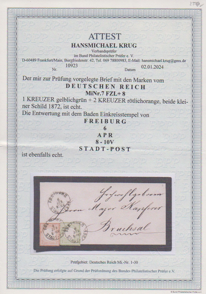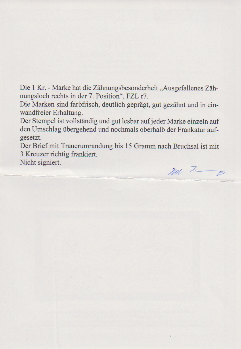 1 Kr. gelbgrün, Besonderheit "fZlr7" (fehlendes Zahnloch), nebst 2 Kr. ziegelrot auf schwarz gerandetem Kabinett-Trauercouvert mit K1 "Freiburg Stadt-Post" nach Bruchsal, Attest Krug