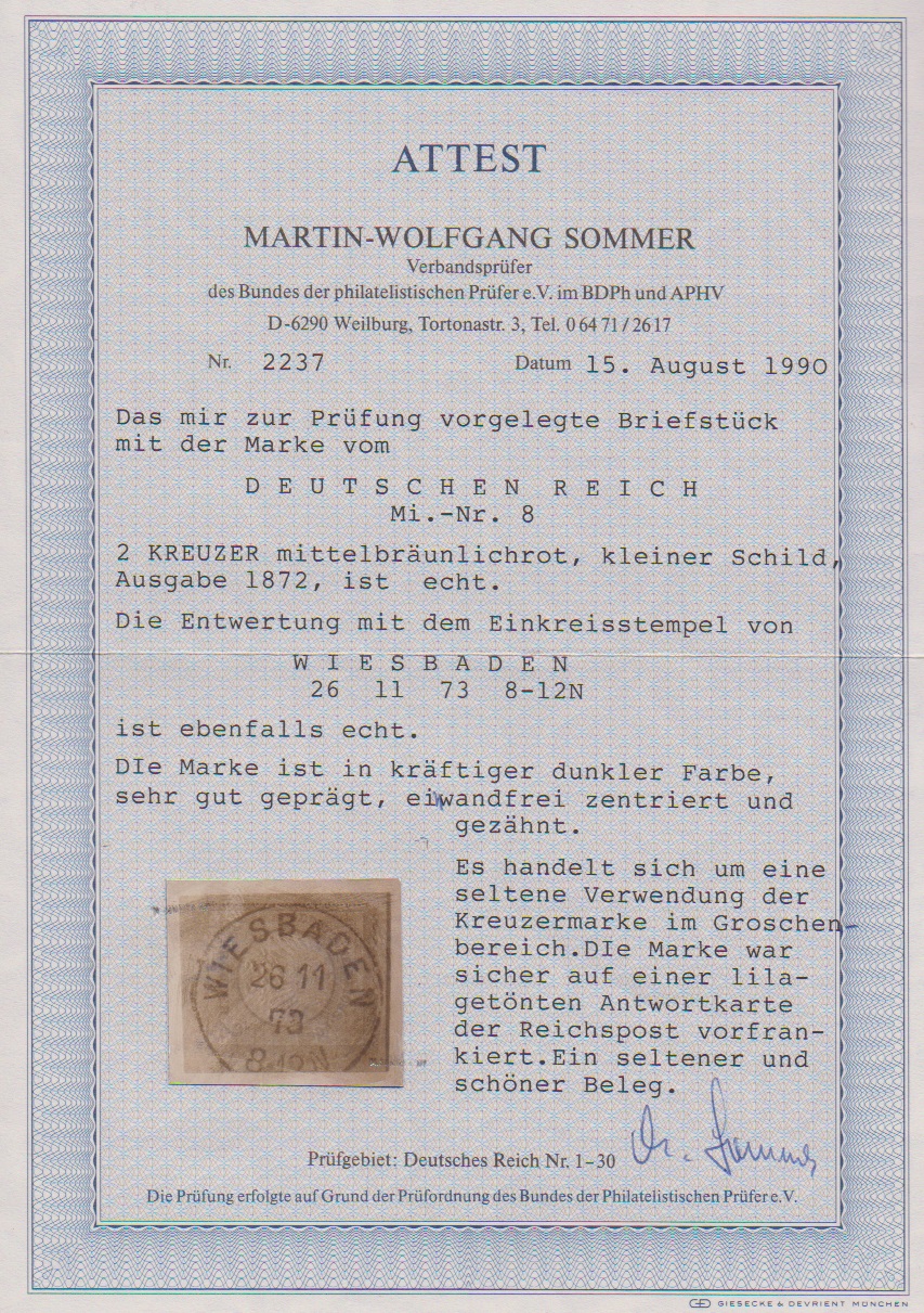 2 Kr. ziegelrot auf Kabinettbriefstück mit klarem K1 "Wiesbaden". Seltene Verwendung der Kreuzer-Marke im Groschenbezirk! Attest Sommer
