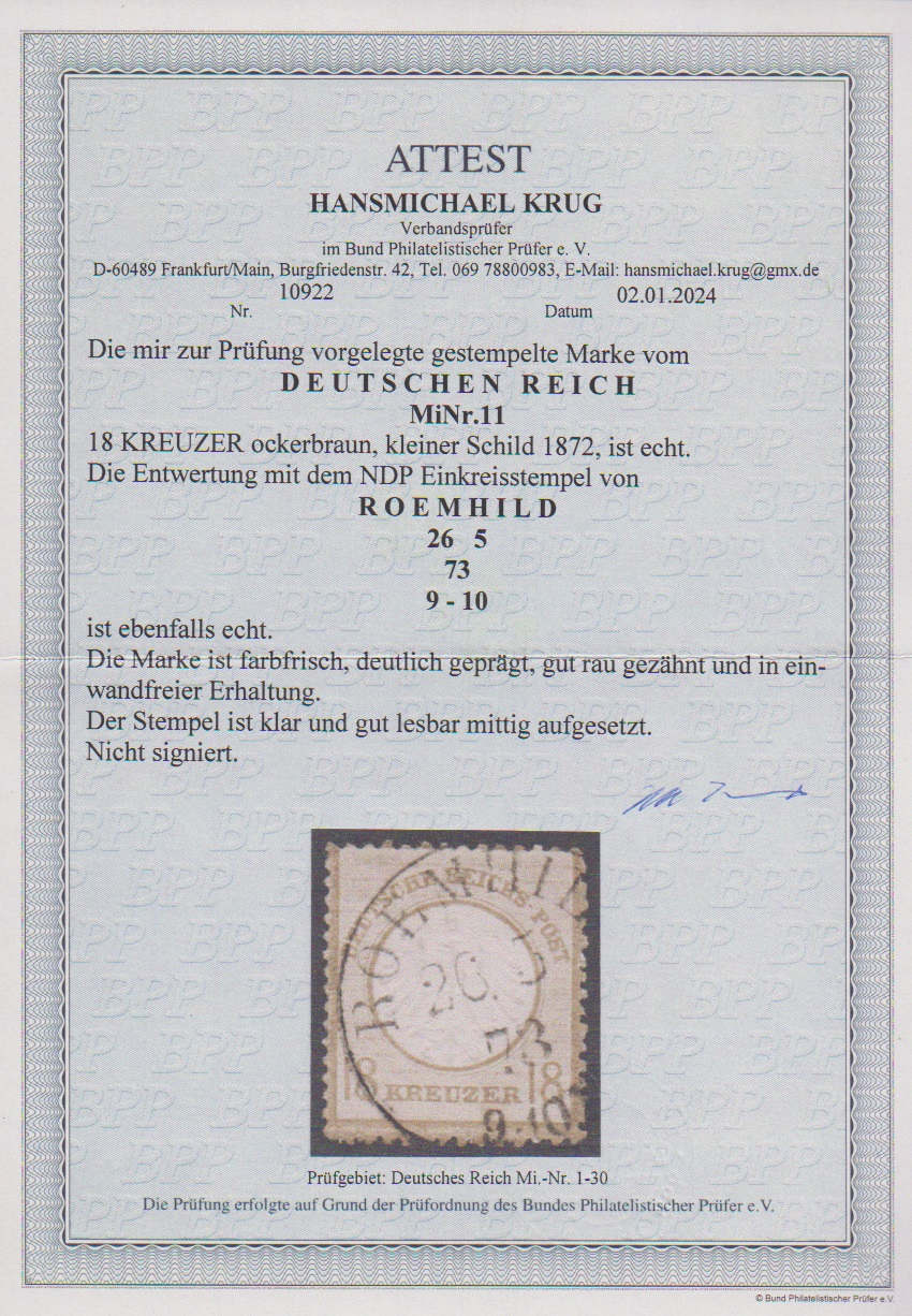 18 Kr. ockerbraun, Kabinettstück mit klarem K1 "Roemhild", Attest Krug. Mi. 500,-