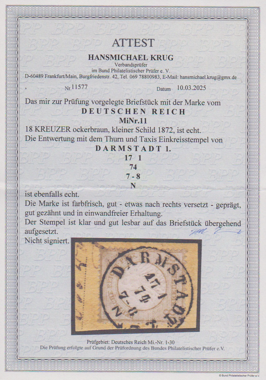 18 Kr. ockerbraun auf Kabinettbriefstück (von gelber Paketkarte) mit Taxis-K1 "Darmstadt", Attest Krug. Mi. 500,-