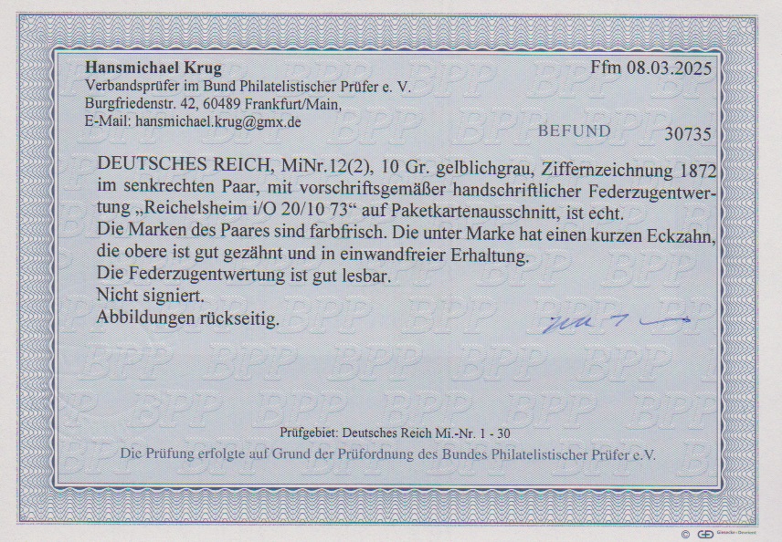10 Gr. grau im senkrechten Paar auf dekorativem gelbem Paketkarten-Abschnitt mit hs. Entwertung "Reichelsheim i.O.", untere Marke etwas "eckrund", obere gut. Fotoexp. Krug. Mi. 650,- +