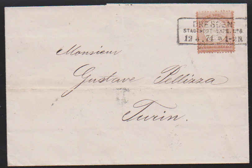 2 1/2 Gr. rotbraun, Prachtstück auf gef. Auslandsbrief von Dresden 1874 nach Turin/Italien