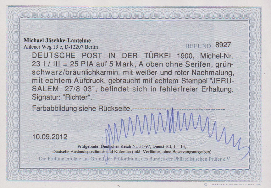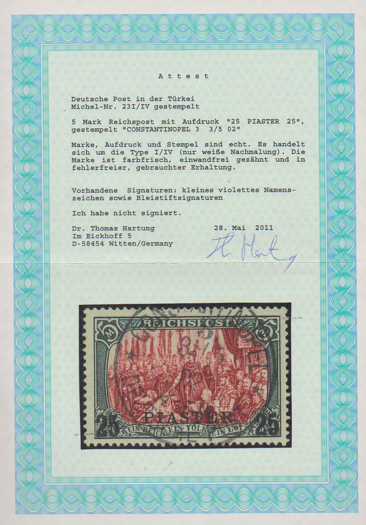 25 Pia. a. 5 Mk. Reichspost, Urmarke in Type IV, tadellos und schön zentrisch gestempelt "Constantinopel", Attest Hartung. Mi. 650,-