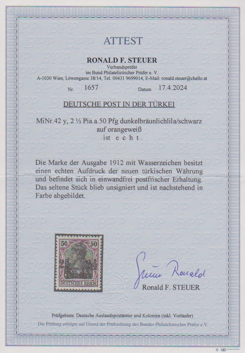 2 1/2 Pia. a. 50 Pfg. auf seltenem orangeweißem Papier tadellos postfrisch, eine unterbewertete Marke! Attest R. Steuer. Mi. 600,-