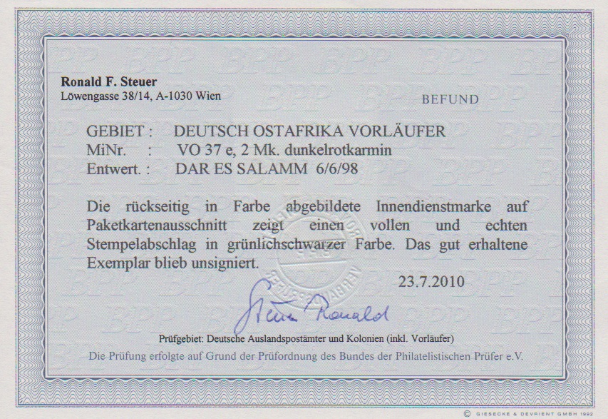 Vorläufer 2 Mk. rotkarmin auf Briefstück mit K1 "Dar-Es-Salaam" vom 6.6.1898 in seltener grünlichschwarzer Farbe, Fotoexp. R. Steuer