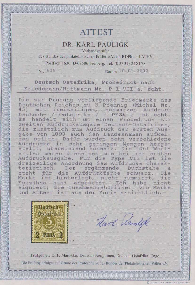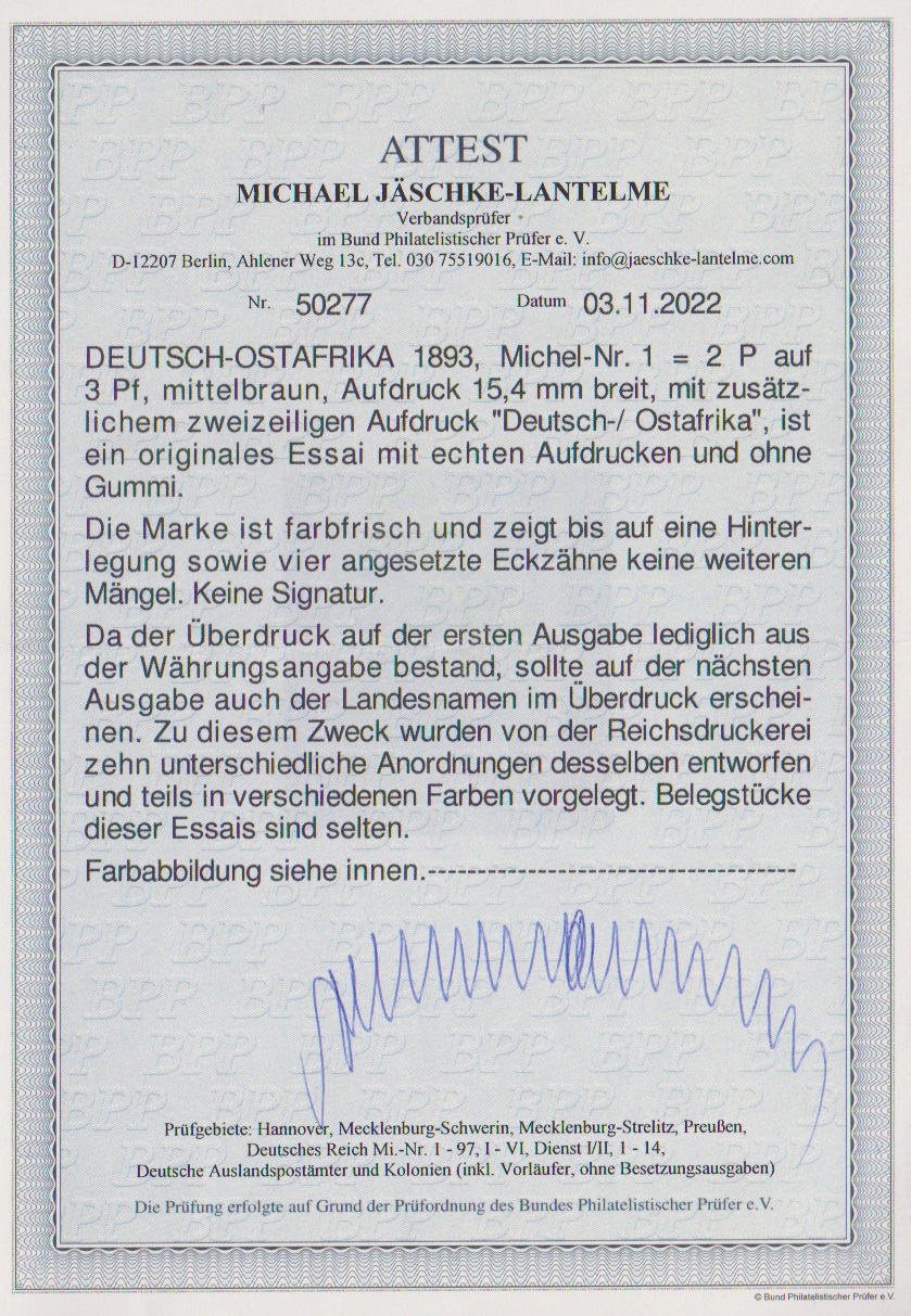 2 Pesa a. 3 Pfg., ungebrauchtes Essay (Eckzahnergänzungen bzw. Hinterlegung) mit Aufdruck "Deutsch-Ostafrika", selten, Atteste Jäschke-L., Pauligk