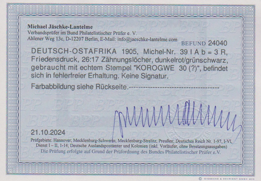 3 R. Kaiseryacht, Kriegsdruck, tadellos gest. "Korogwe", Fotoexp. Jäschke-L. Mi. 300,-