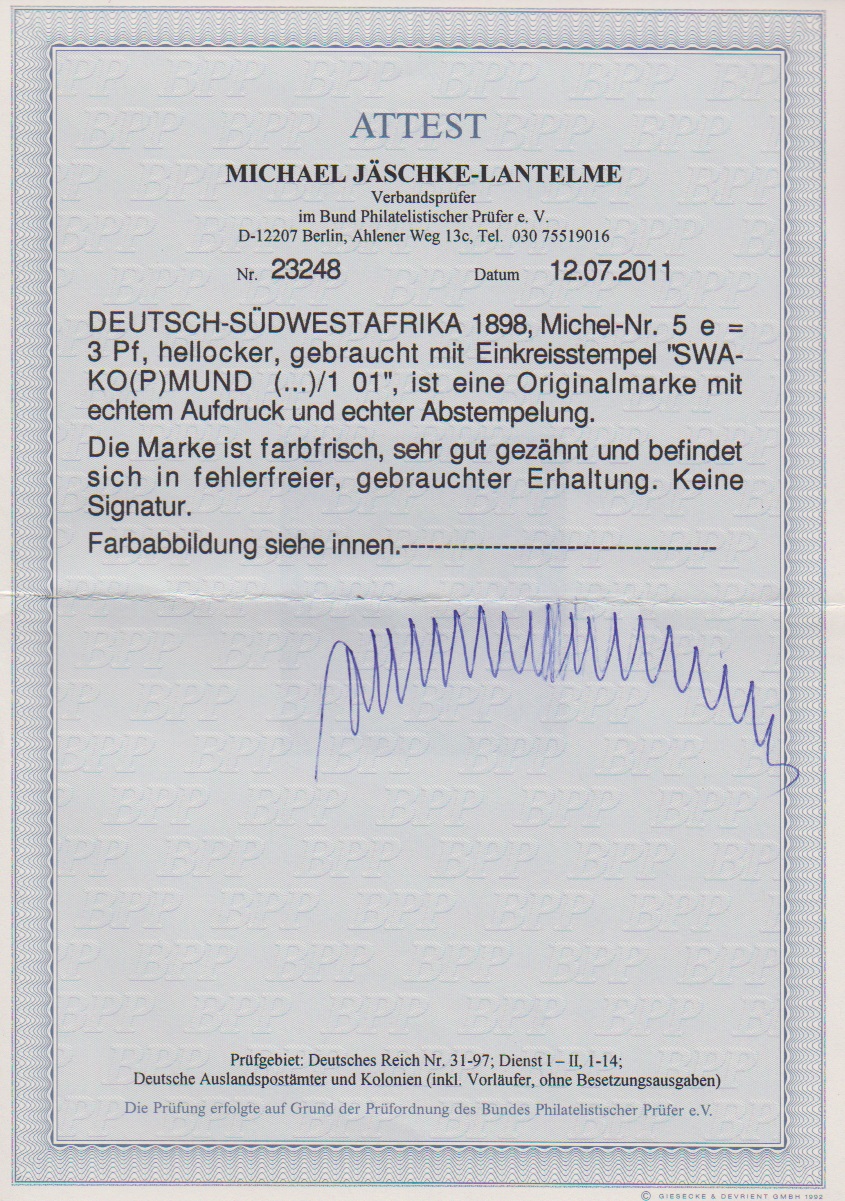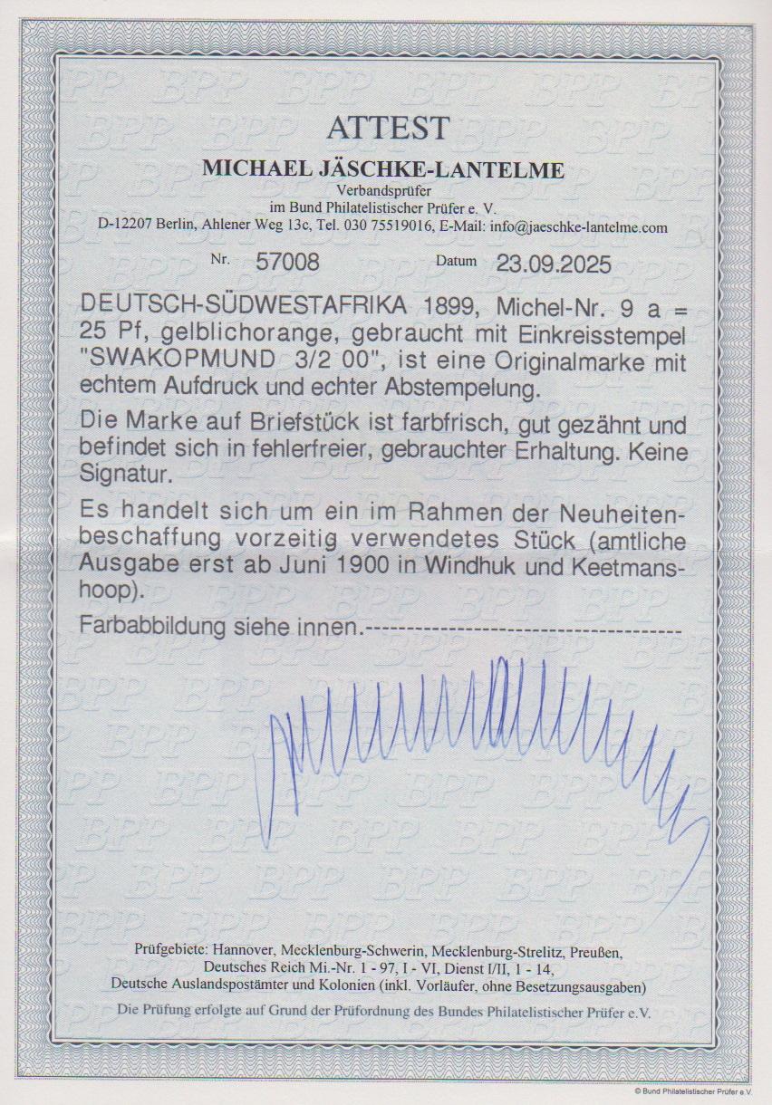 25 Pfg. gelblichorange auf tadellosem Briefstück mit seltenem frühem Stempel "Swakopmund 3.2.00", vorzeitig verwendet vor der amtlichen Ausgabe der Freimarken im Juni 1900, Attest Jäschke-L. Mi. 1300,-