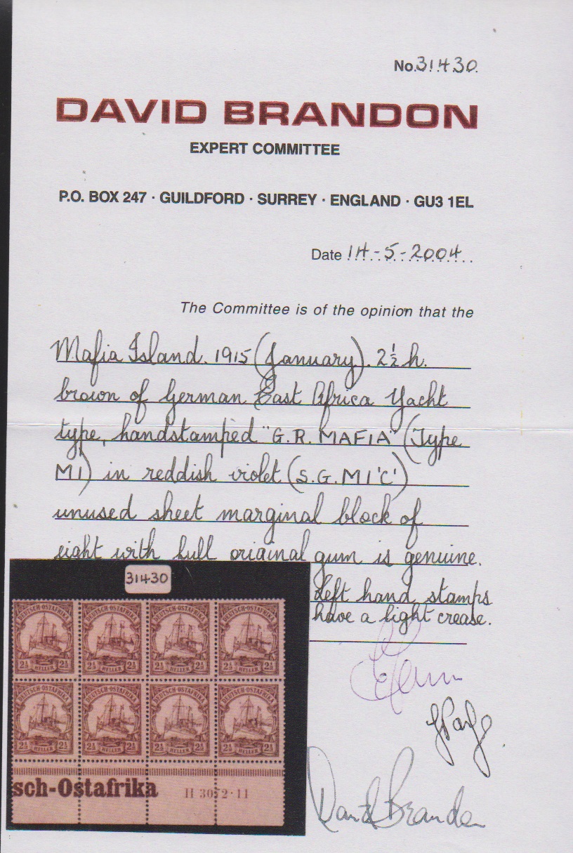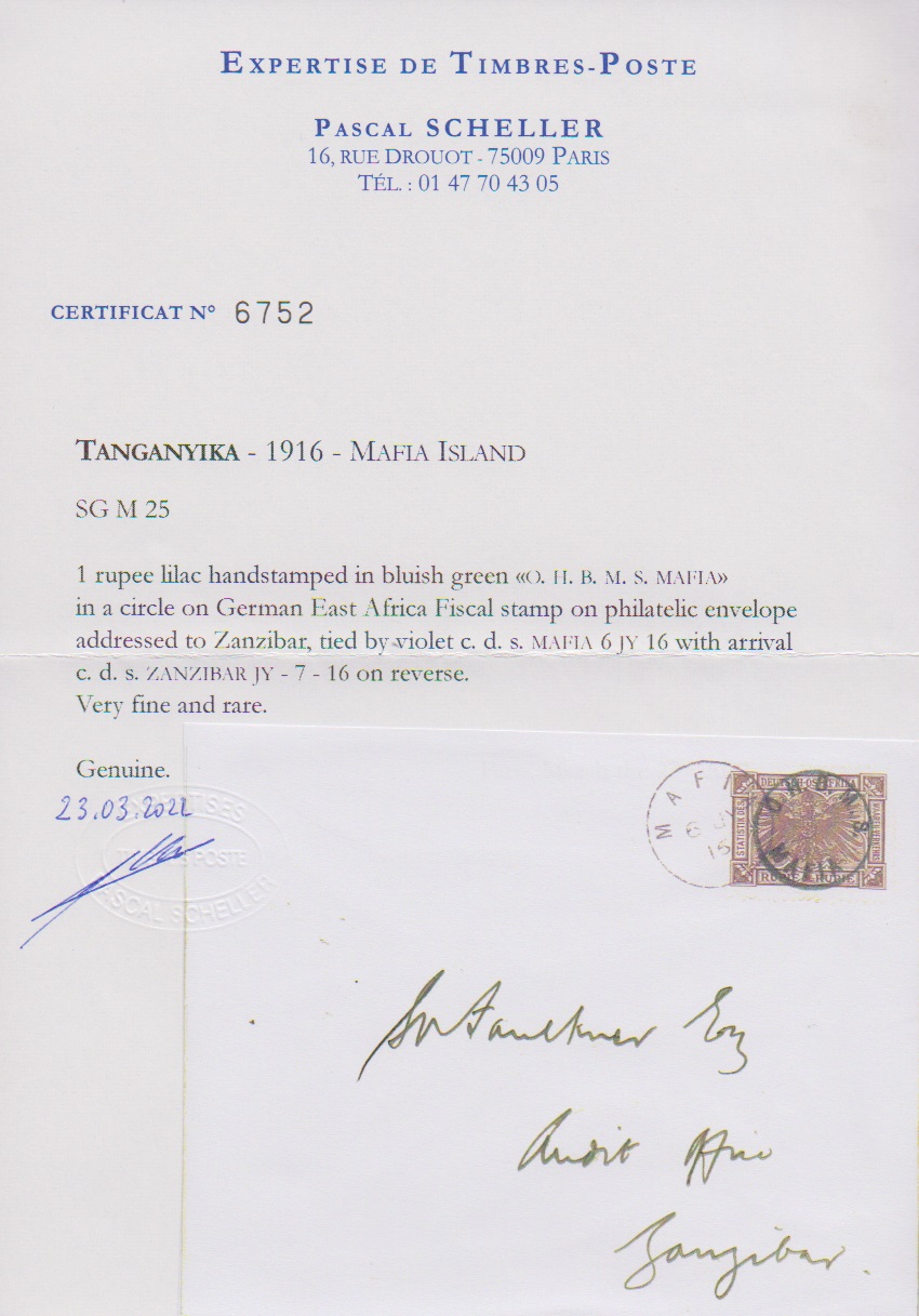 Britische Besetzung, "MAFIA", 1916, 1 Rupie lila mit Handstempel auf Couvert, nach Zanzibar gelaufen mit rs. Ankunftsstempel (Gouverneursbrief mit rs. Absenderprägung). Auf Brief sehr selten! Attest Scheller. Foto siehe Katalog-Rückseite