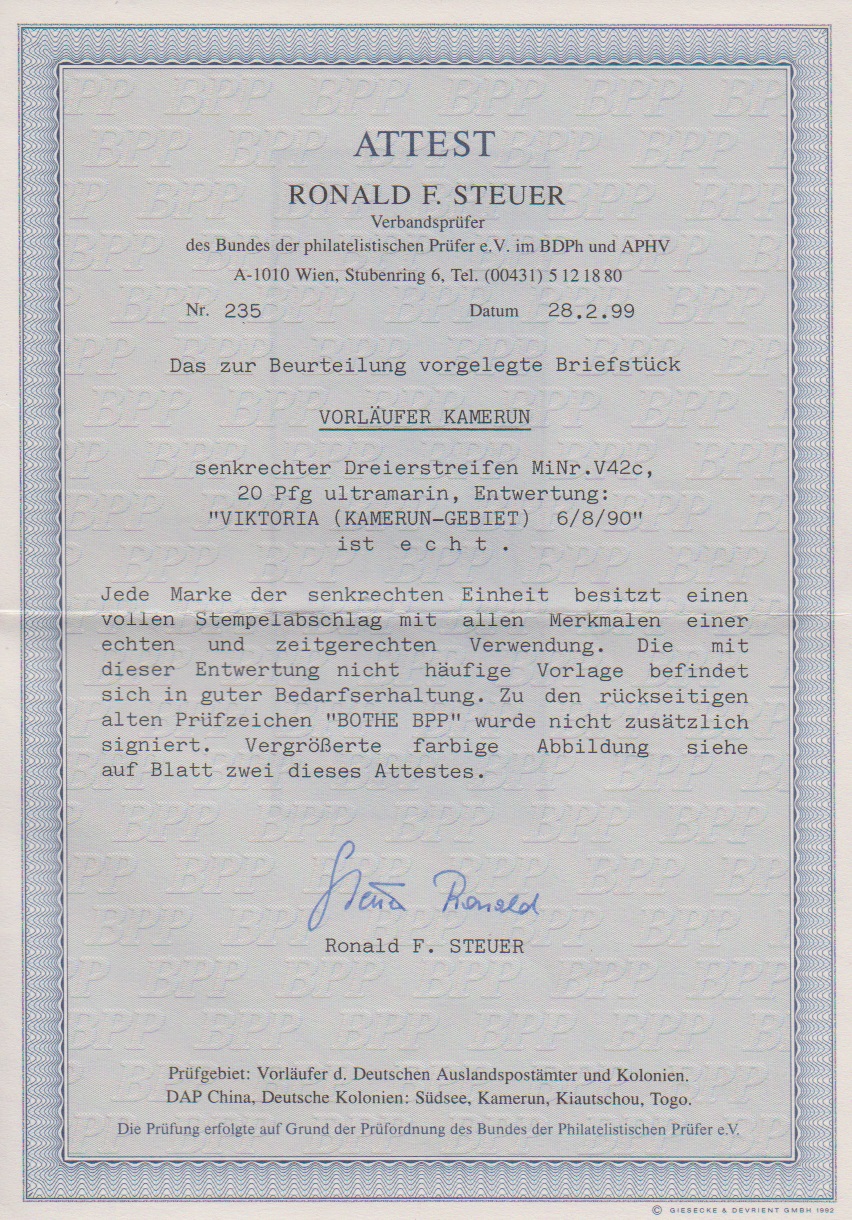 Vorläufer 20 Pfg. ultramarin im Dreierstreifen auf Briefstück mit K1 "Viktoria (Kamerun-Gebiet)", 6.8.1890. Sign. Bothe und Attest R. Steuer. Mi. lose 300,- +