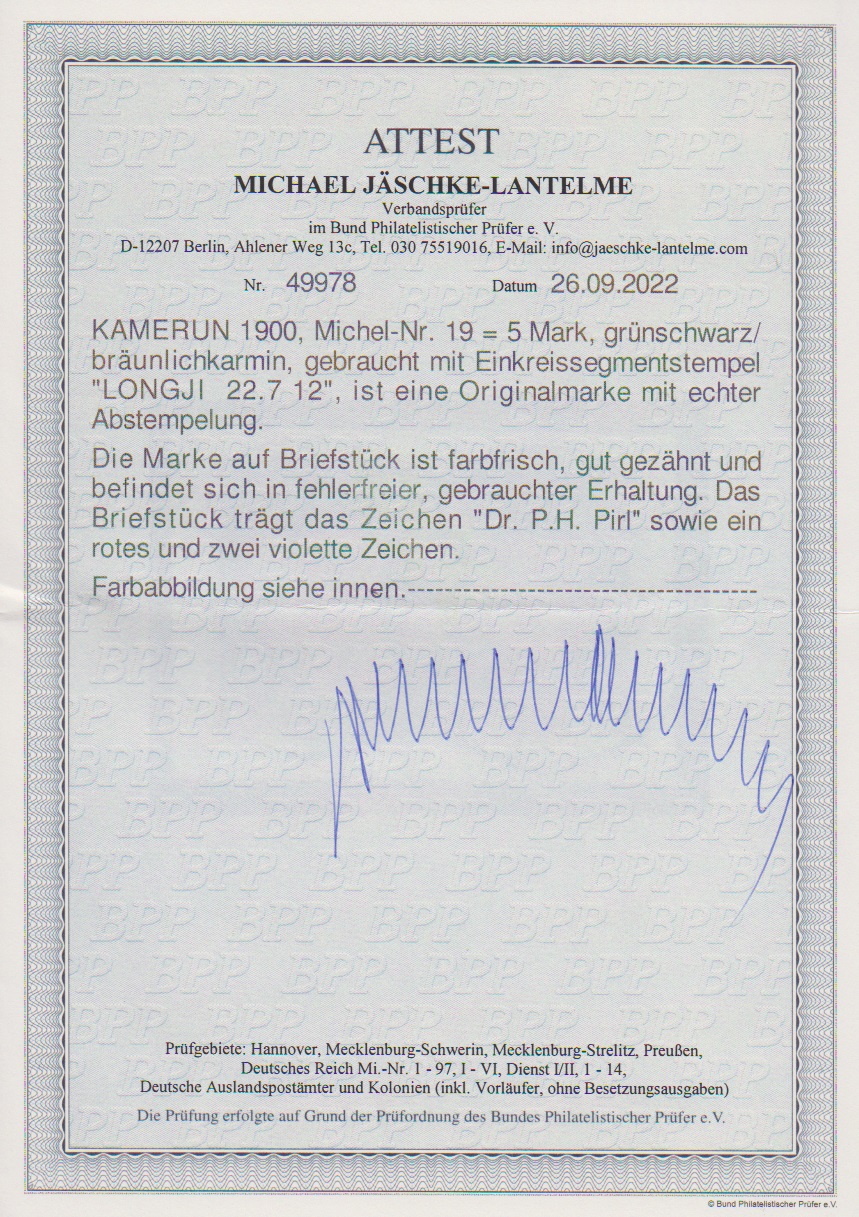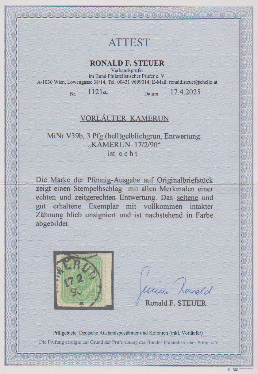 Vorläufer 3 Pfg. grün auf kleinem Briefstück mit K1 "Kamerun" v. 17.2.90, Attest R. Steuer. Mi. 2000,-