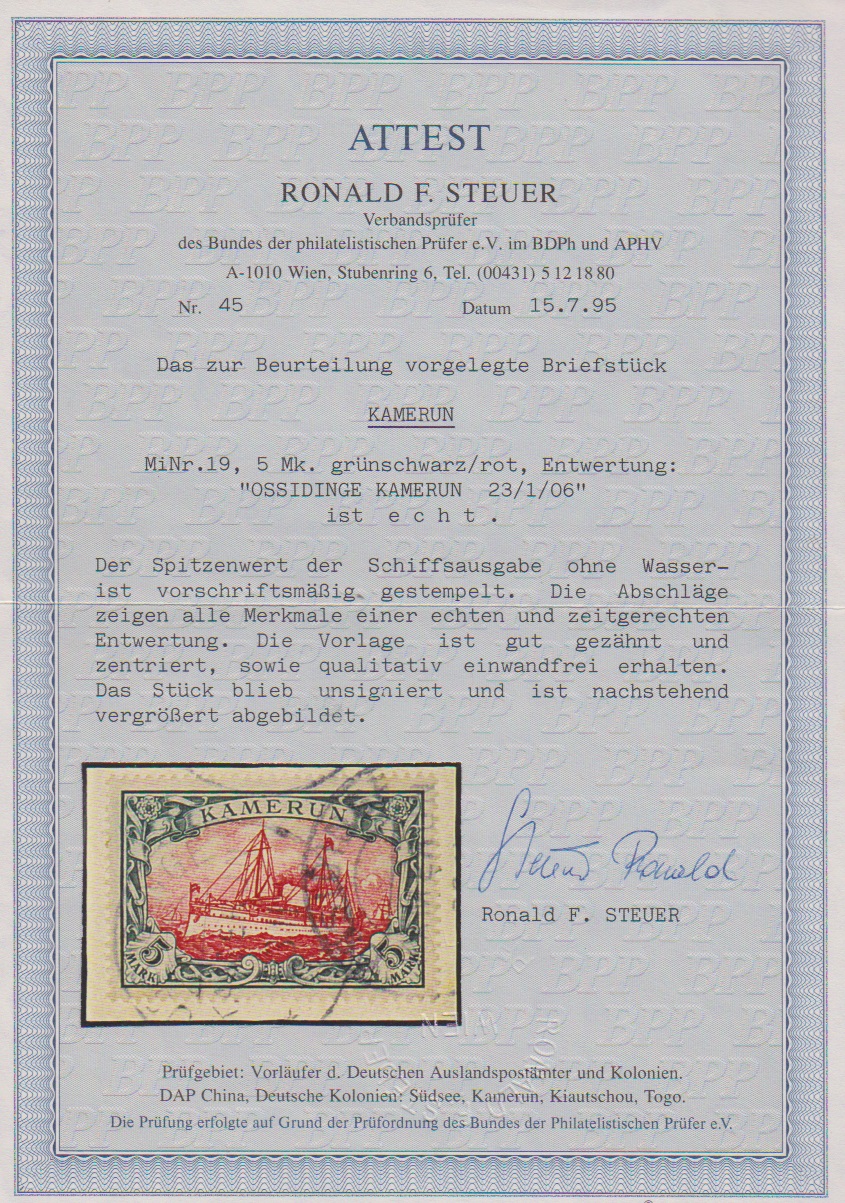 3 ("Lolodorf") und 5 Mk. ("Ossidinge") Kaiseryacht je auf tadellosen Briefstücken, sign. Brandes bzw. Attest R. Steuer. Mi. 740,-