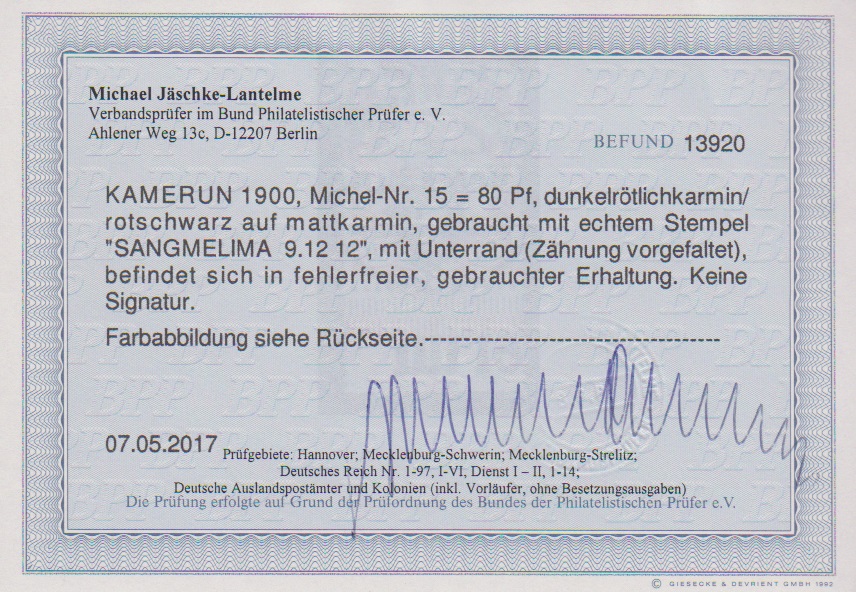 80 Pfg. vom Unterrand mit Randinschrift und gutem Stempel "Sangmelima" schön zentrisch, Fotoexp. Jäschke-L.