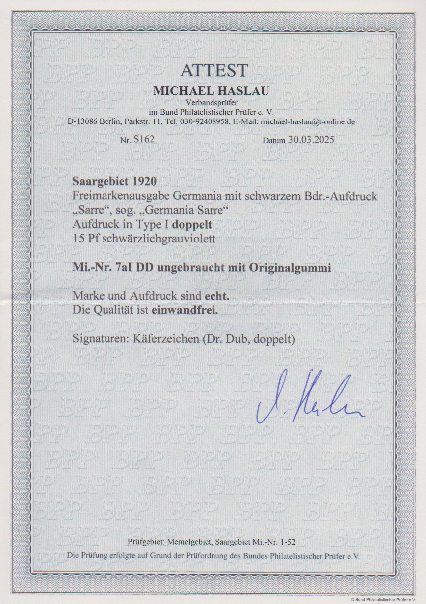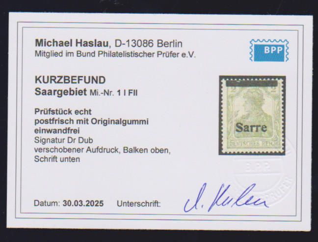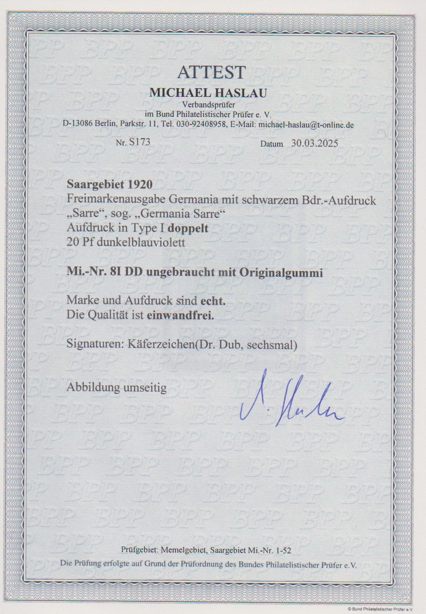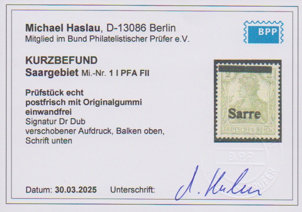 15 Pfg. schwarzgrauviolett mit doppeltem Aufdruck "Sarre" in Type I tadellos ungebraucht, Mi. 1000,-, sign. Dub und Attest Haslau (2025)