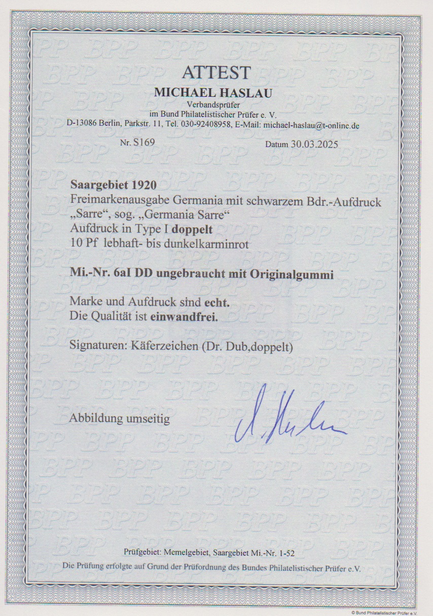 10 Pfg. karminrot mit doppeltem Aufdruck "Sarre" tadellos ungebraucht, sign. Dub und Attest Haslau (2025). Mi. 900,-