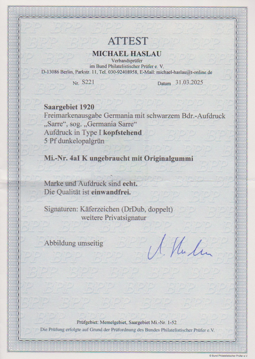 5 Pfg. mit kopfstehendem Aufdruck "Sarre" tadellos ungebraucht, sign. Dub und Attest Haslau (2025). Mi. 750,-