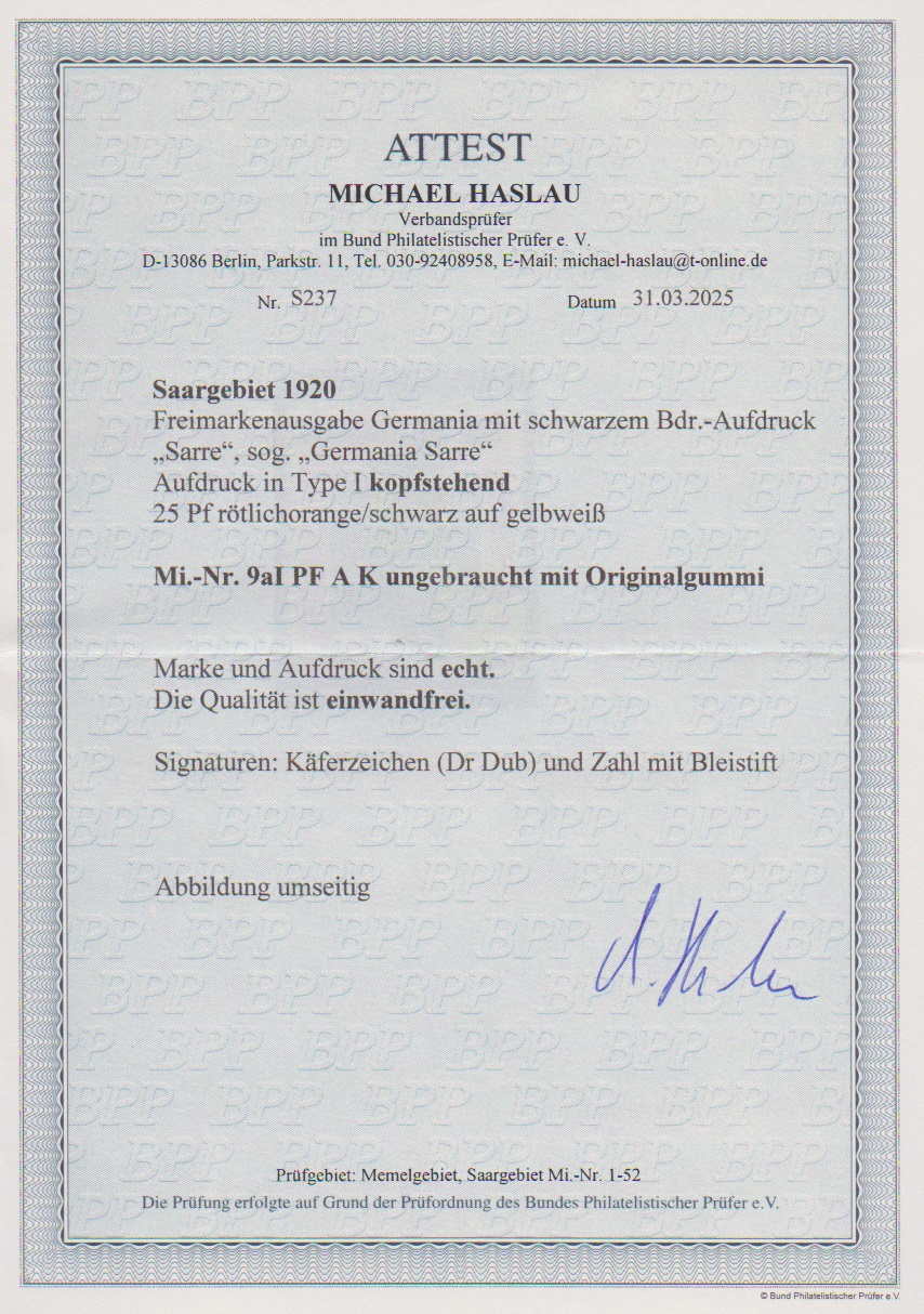25 Pfg. mit Aufdruck "Sarre" in Type I kopfstehend und zusätzlich Aufdruckfehler "A" tadellos ungebraucht, Mi. 1000,- + Aufschlag für PF A (analog 50% = 1500,-), sign. Dub und Attest Haslau (2025)