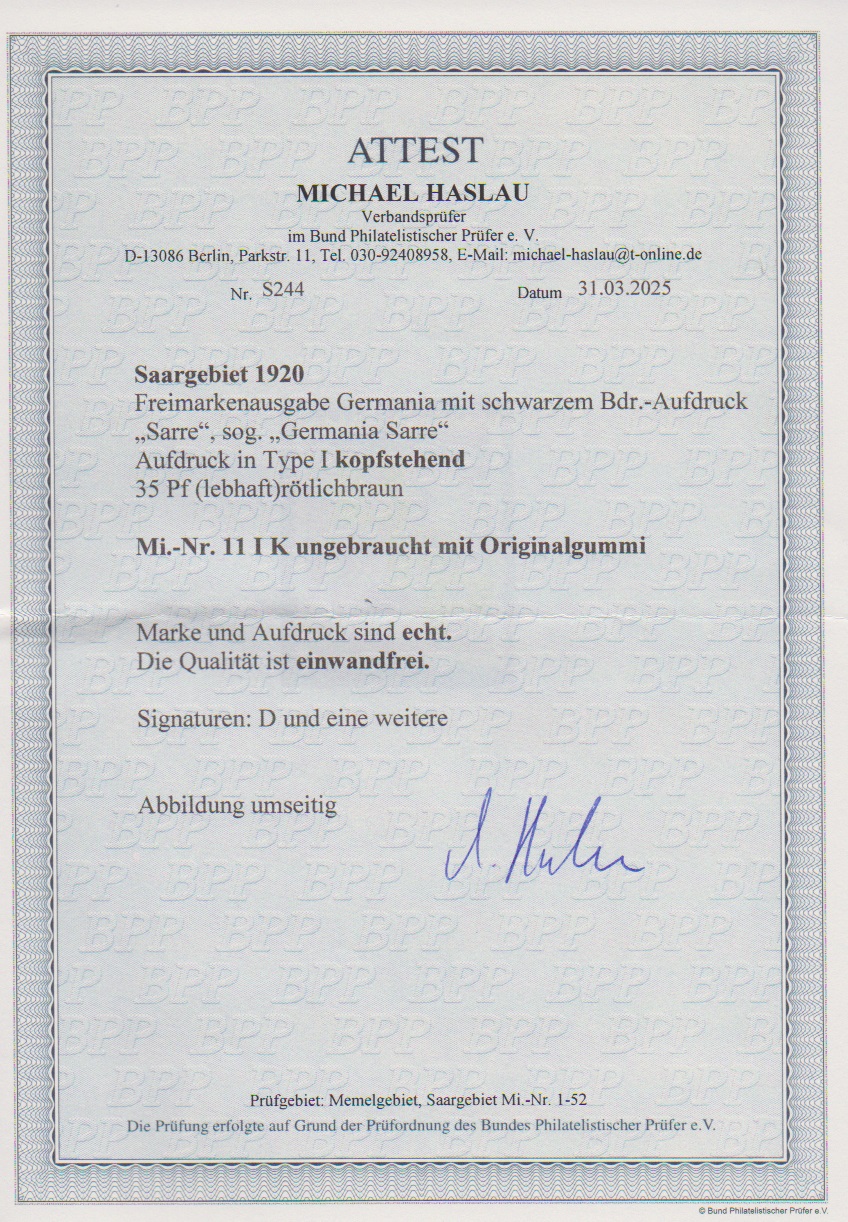 35 Pfg. mit kopfstehendem Aufdruck "Sarre" in Type I tadellos ungebraucht. Sign. Dub und Attest Haslau (2025). Mi. 600,-