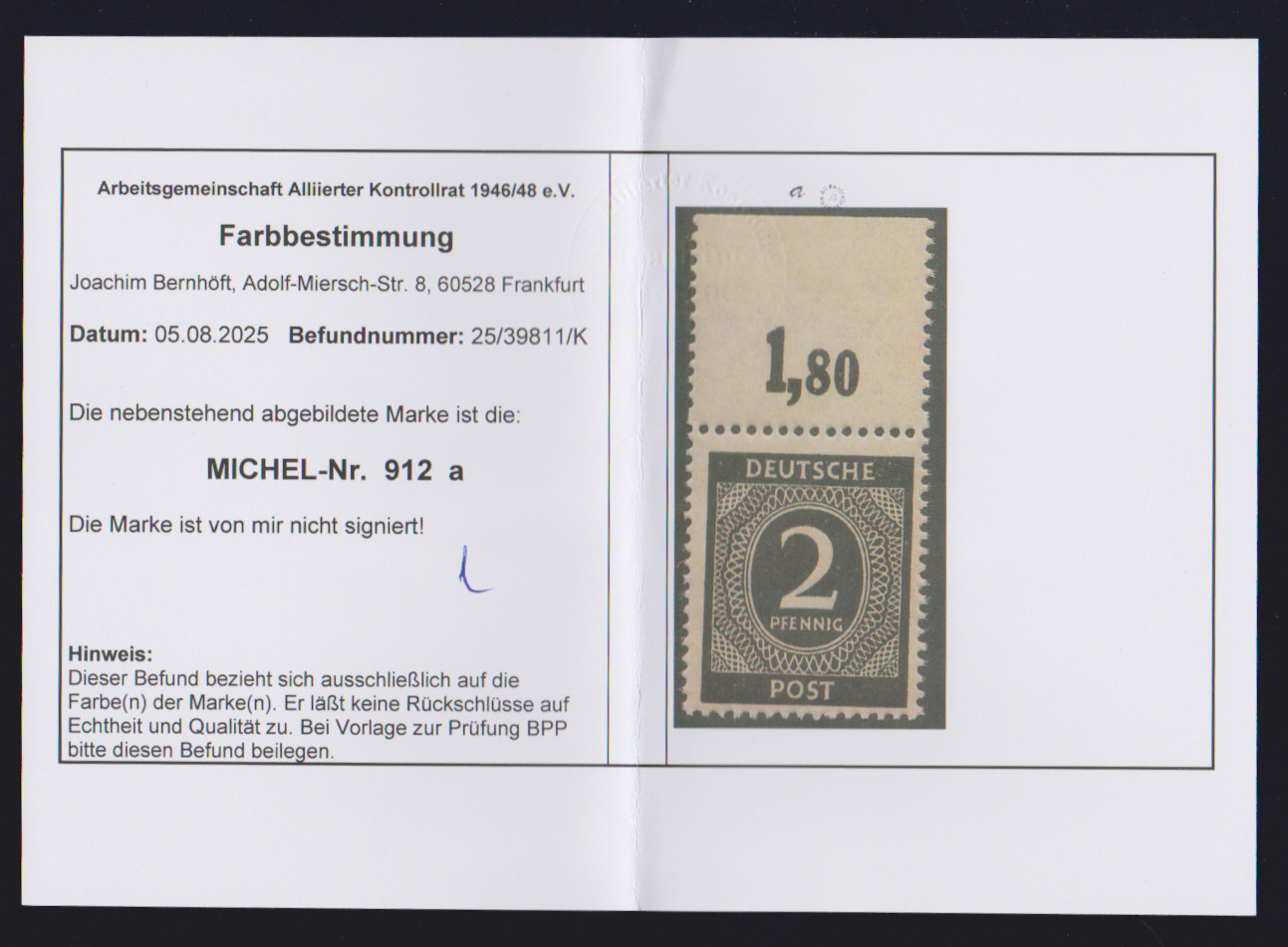 2 Pfg. ungezähnt postfrisch, sign. Wittmann. Mi. 300,-
