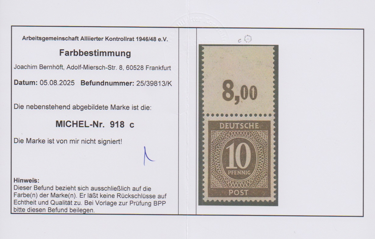 10 Pfg., postfrische linke untere Bogenecke mit Druckerzeichen "F", Mi. 150,-