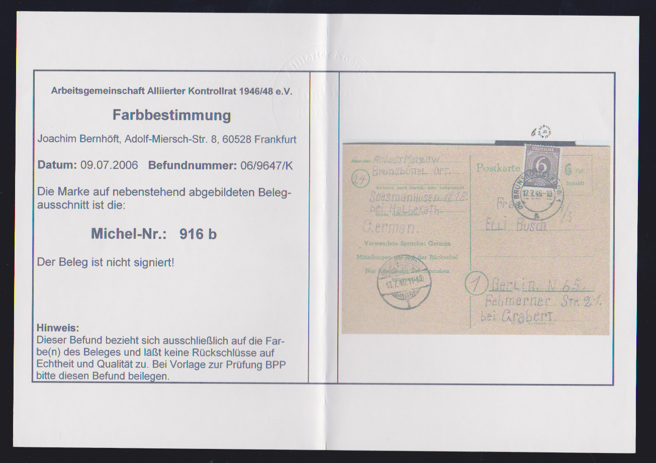 6 Pfg. in guter Nuance "schwarzviolettgrau", etwas über den Rand geklebt, auf Behelfs-Ganzsachenkarte 6 Pfg. ab Brunsbüttelkoog, 17.7.46, nach Berlin. Mi. 500,-, Fotoexp. Bernhöft